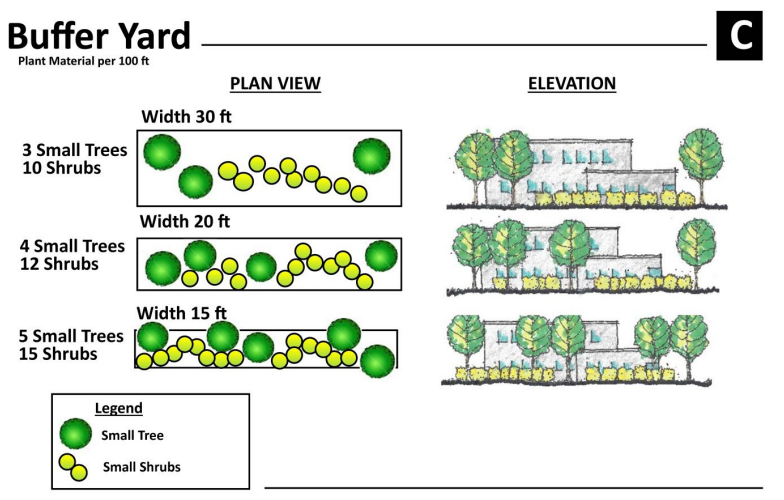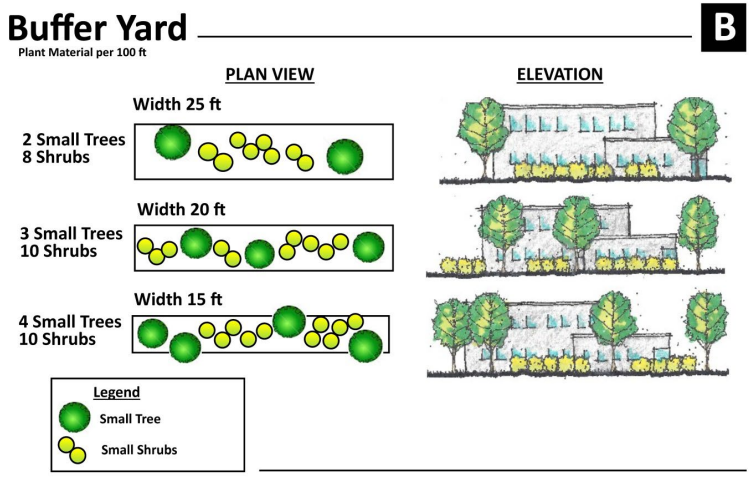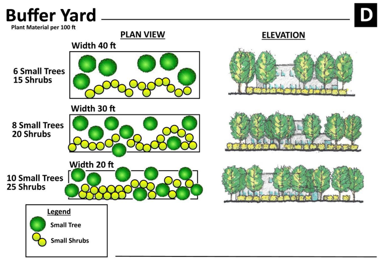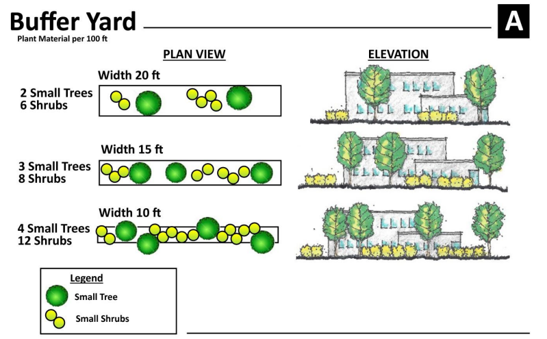 Upon determining the type of buffer yard required for a property (Type A, B, C, or D), the yard width and number of plantings shall be calculated. Three options are offered within each buffer yard type, allowing a buffer yard which best fits the constraints and features of the site. Any of the options within a particular buffer yard type will fulfill the buffer yard requirement. For example, if a Buffer Yard A is required, there are three options to choose from a 10 foot wide buffer, a 15 foot wide buffer, or a 20 foot wide buffer. The number of trees and shrubs to be planted within the buffer yard area is dependent upon the buffer yard width chosen; a wider buffer yard requires less plant material.