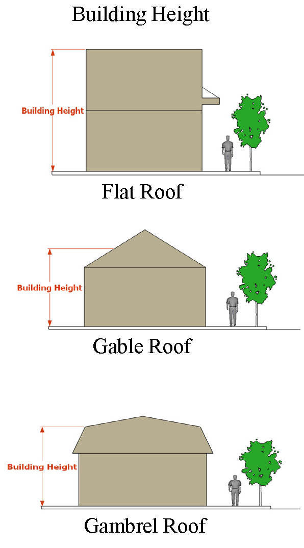 Building height. The vertical distance measured from the established grade to the highest point of the roof surface for flat roofs; to the deck lines of mansard roofs; and to the average height between eaves and ridge for gable, hip and gambrel roofs; or to a point equivalent to the foregoing on any other roof. Where a building is located on sloping terrain, the height may be measured from the average ground level of the grade at the building wall.