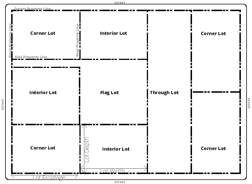 Property Line. Also referred to as lot line. A boundary line of a parcel of land or lot. Refer to Figure 1.6-A Lots.