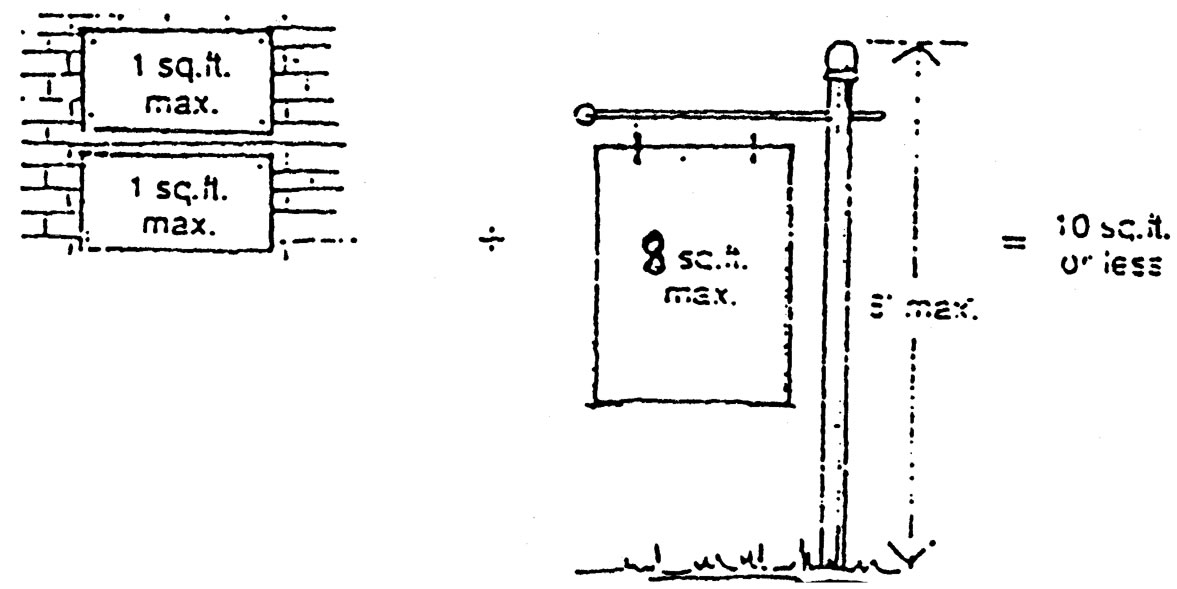 Residential and noncommercial directional signage shall be allowed as specified in section 5. Business signage shall be as follows: For each parcel in the P-1 zone, eight square feet of sign area shall be allowed. Such sign may be in form of a single sign or in a combination of not more than two signs subject to the following limitations:
