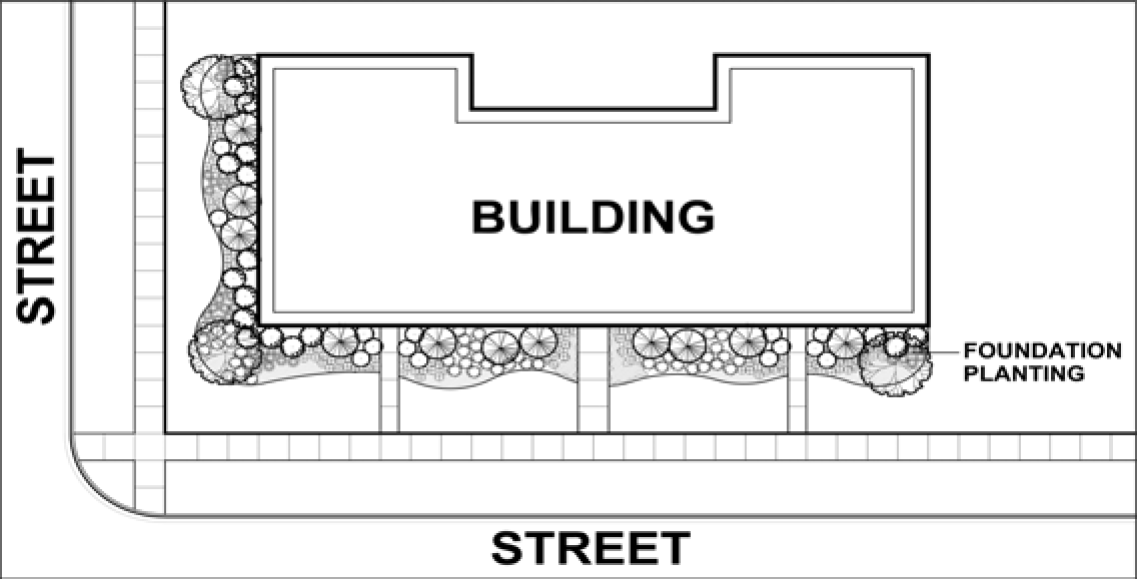 Building foundation landscaping is required in all districts for all new construction and additions to buildings that are visible from a street, including all front and corner side yards.