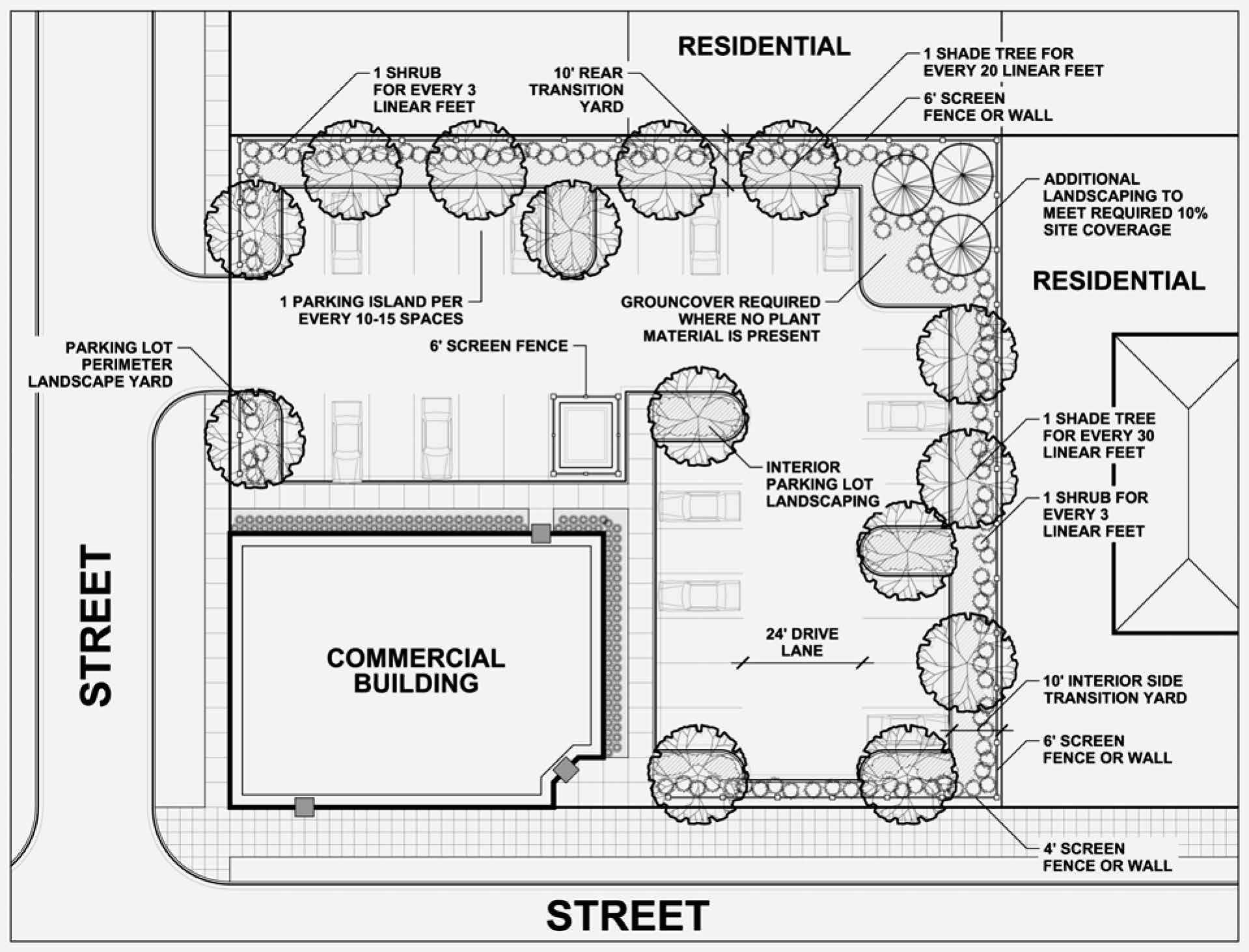 This section establishes standards for the dimensions and improvement requirements of transition yards between land uses and/or zoning districts within the rear or interior side yard (see Figure 17.32.120.1: Transition Yard Locations). Nothing in this section shall be deemed to prevent the applicant's voluntary installation of transition yards to these design specifications. See Figure 17.32.140.1 (Illustration of Landscaping and Screening Requirements) for a graphic illustration of such landscaping.