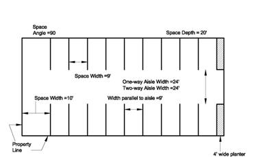 For angled parking, the minimum distance of the first parking space for angle parking shall be ten feet from the property line.