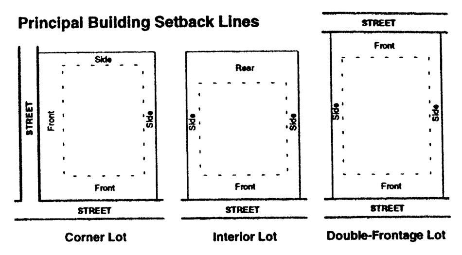 Side building setback: The minimum allowable distance between a side lot line and any part of a principal building on a lot. The side building setback extends along the side lot line between the front building setback and a rear building setback.