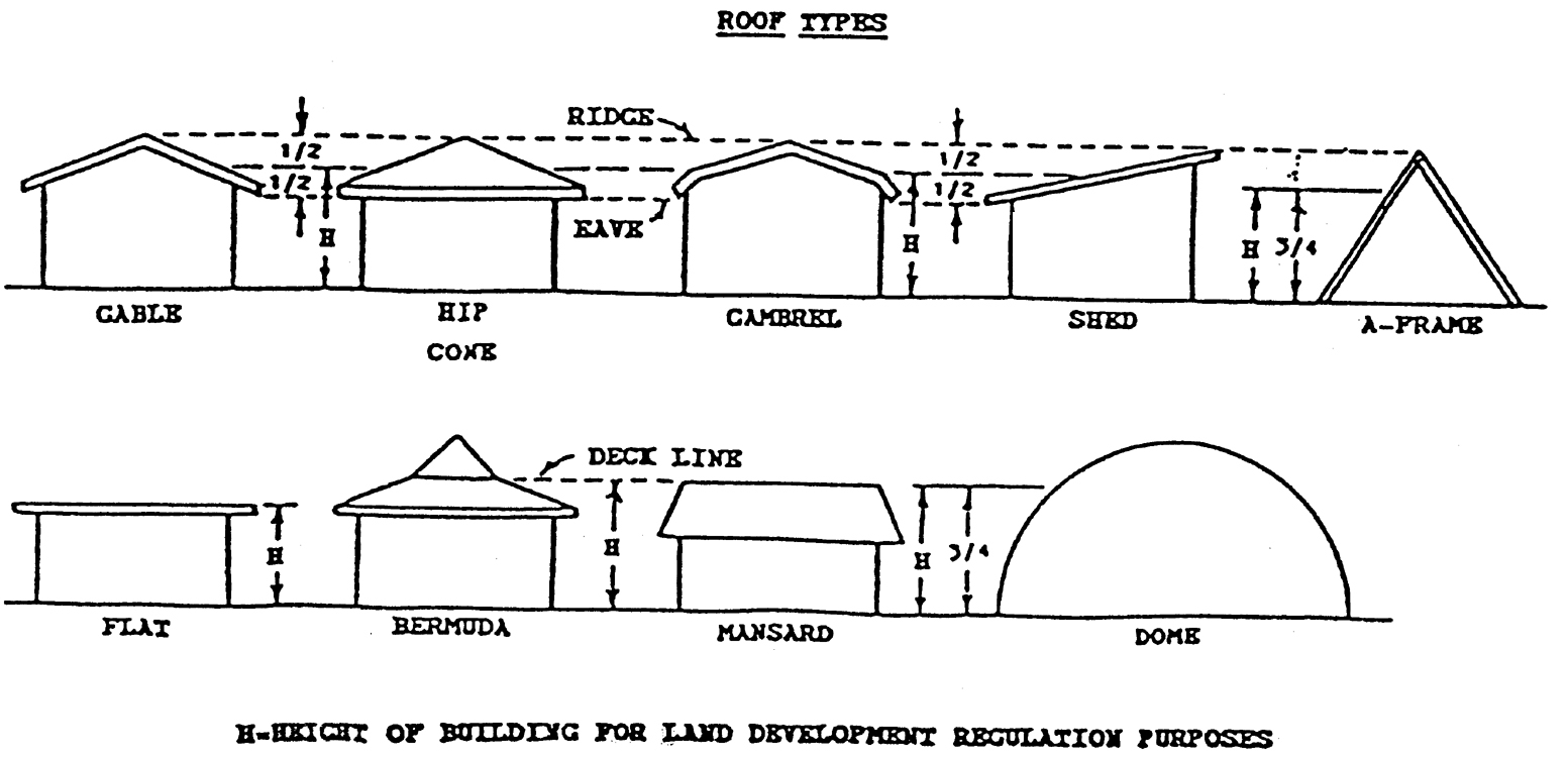 Building, height of. Height of building is the vertical distance measured from the established grade at the corner of a front of a building to the highest point of the roof surface of a flat roof, to the deck line of a mansard or Bermuda roof, to the mean height level between eaves and ridge of gable, hip, cone, gambrel and shed roofs, and to a height three-fourths the distance from the ground to the apex of A-frame and dome roofs, as depicted in the diagram below. (See article 4, exclusions from height limitations).