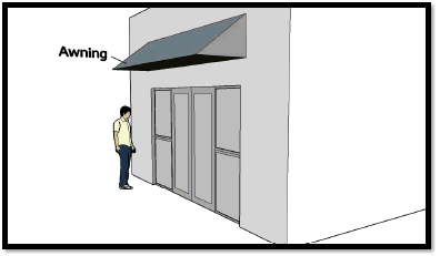 Awning. A shelter constructed of rigid or nonrigid materials on a supporting framework, either freestanding, or projecting from and supported by an exterior wall of a building. Sometimes referred to as a canopy.