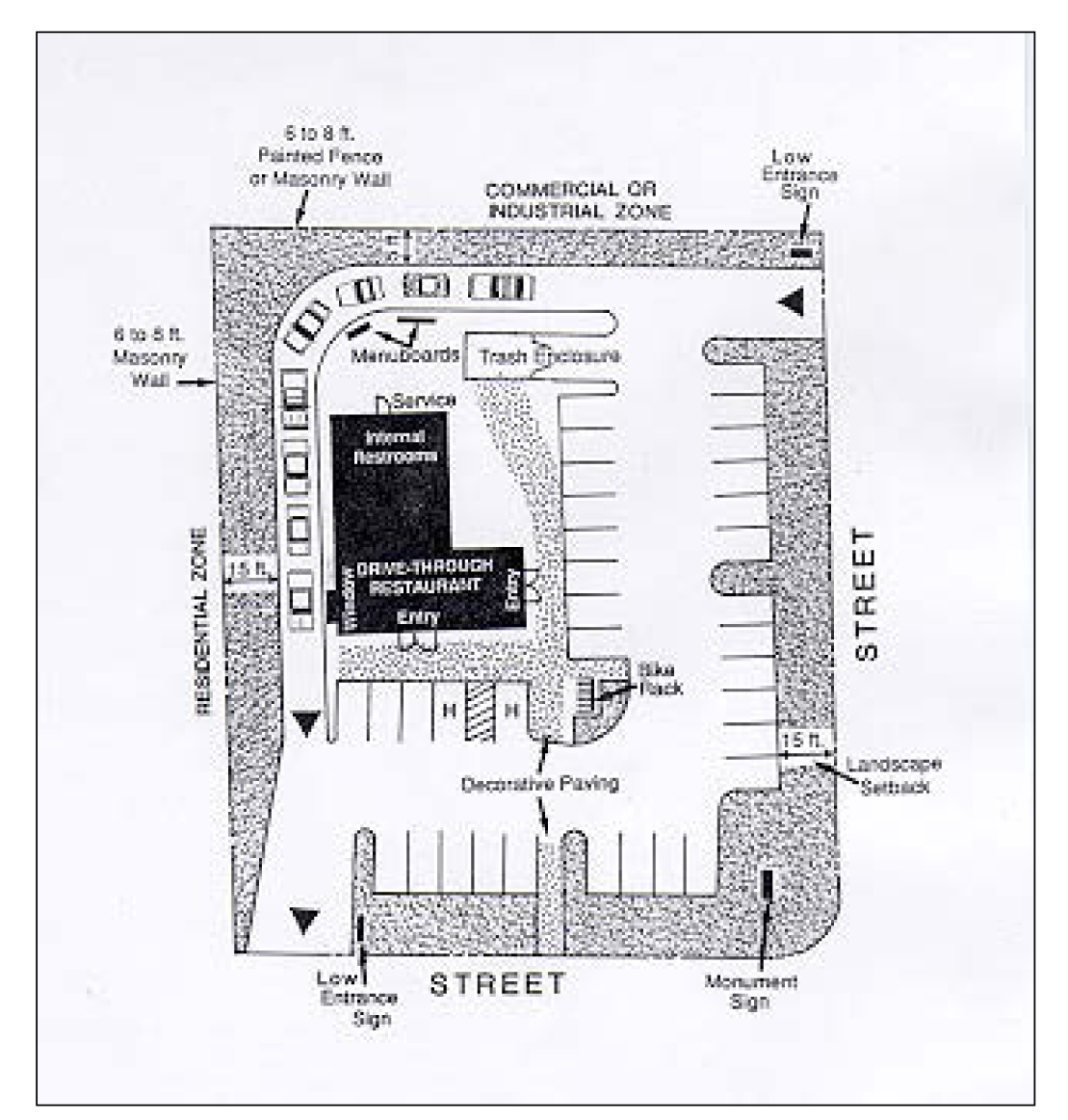 Drive-through aisles and pick-up windows may be located between the building and the right-of-way, but their visibility should be minimized through the use of innovative building architecture and mounded or bermed landscaping to minimize their visual impact from the street. Menu board(s) shall be placed so as to not be visible from the street.