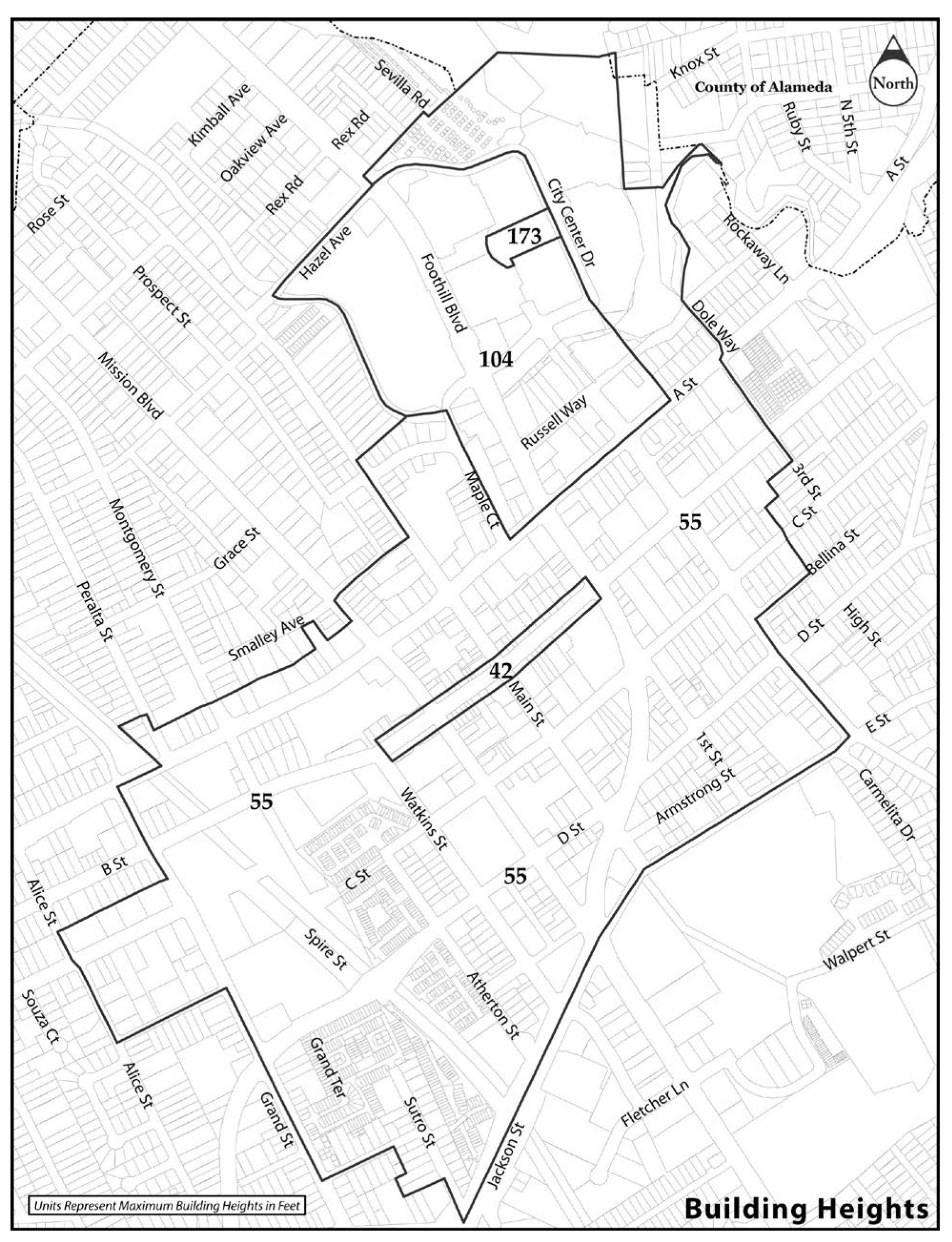 Maximum Building Height: Maximum height shall be established in substantial compliance with the Downtown Hayward Design Plan, and as indicated herein.