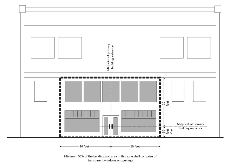 Facade Transparency at Primary Entrance. A minimum of 50 percent of the building wall area located within 20 feet of the midpoint of a primary building entrance shall be comprised of transparent windows or openings. Glass is considered transparent where it has a transparency higher than 80 percent and external reflectance of less than 15 percent.