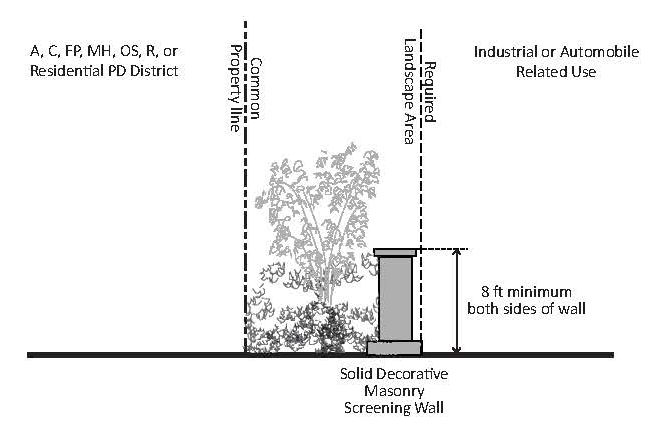 Required Walls Between Industrial and Other Districts. A solid masonry screening wall shall be provided where an Industrial District abuts any A, C, FP, MH, OS, R, or residential PD District.