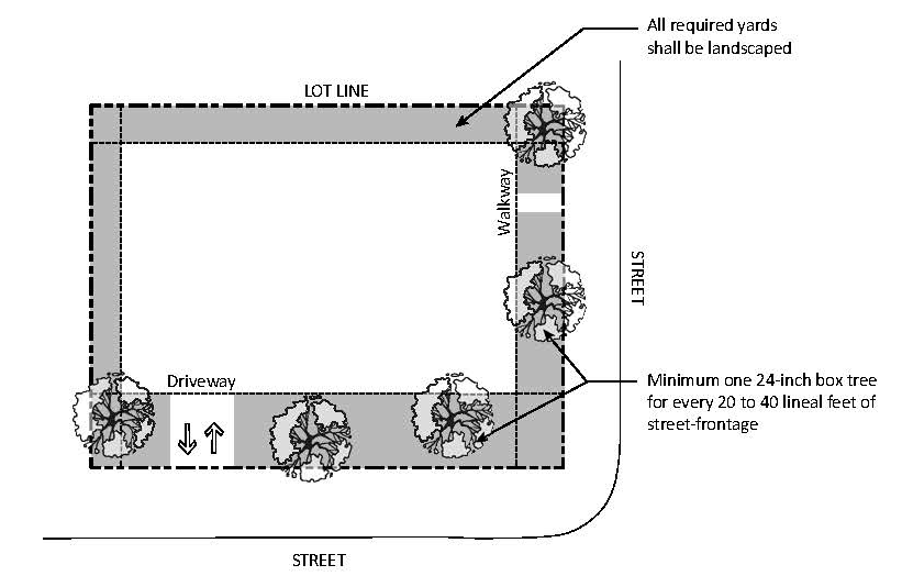 Required Yards. Required front, side, side street, and rear yard areas shall be landscaped, except for permitted driveways, and walkways.