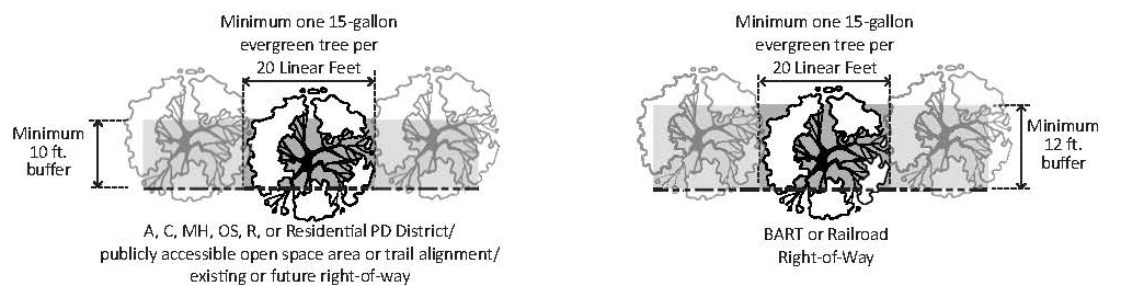 A minimum 12-foot wide landscape buffer planted with a minimum of one 15-gallon evergreen tree per 20 linear feet shall be provided along all property lines abutting the BART and railroad right-of-way.