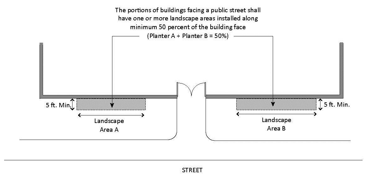 Building Perimeters. Portions of buildings facing a public street shall have one or more landscaped areas with a minimum five-foot-wide landscaped area along a minimum 50 percent of the building face.