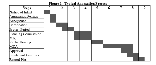 In addition to the process outlined in Sections 10-2-403 et seq of the Utah State Code Figure 1 Typical Annexation Process outlines the review process. The Heber City Annexation Guide and Heber City Annexation Petition are found at the city offices and provide guidance and application procedures for annexation petitions. The annexation timeline will vary based on each petition but generally takes between ten to fifteen months to complete the state and local requirements.