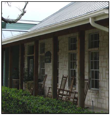 Color can help to coordinate facade elements into an overall composition—one that will highlight features of the façade. Distinctive architectural elements may be dramatized with a contrasting color. Any color scheme should be subdued, not garish, and in keeping with the character and color schemes of nearby structures and the Texas Hill Country.