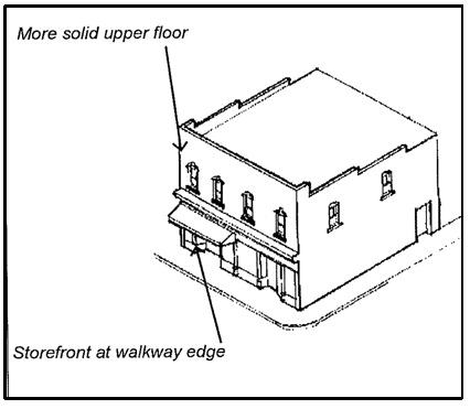 The Traditional Storefront has a retail-oriented first floor. It may have upper floors that typically house offices.