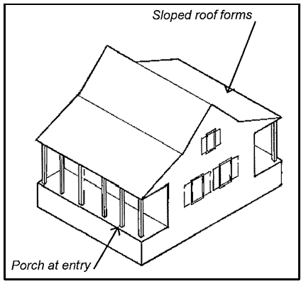 Basic rectangular forms, with hip, gable, or shed roofs, are appropriate.