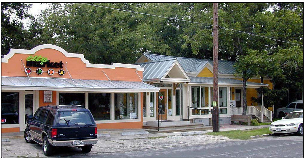 Many of the commercial structures in the Hill Country have flat roofs with parapet walls that extend above the roof. This treatment is encouraged for new structures. A projected cornice at the top of the parapet should be considered in the design of new buildings. A cornice serves to screen roofs and mechanical equipment and provide architectural interest and historic character.