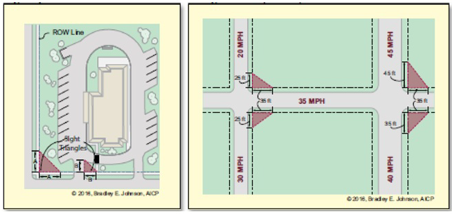 Streets. The vision clearance triangle leg lengths shall be measured from the intersection of right-of-way lines (see "A" in the illustration below). If the right-of-way lines curve, then each right-of-way line shall be extended to form a corner point to measure from. The distances for each leg of the vision clearance triangle shall be as follows.