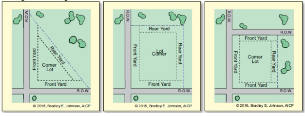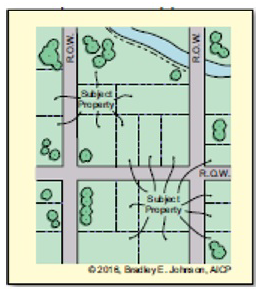Adjacent property. Any property adjacent to or directly diagonal to the subject property. Properties across a public right-of-way (R.O.W.) are also considered adjacent. The illustration below notes the properties that would be considered adjacent to two different subject properties.
