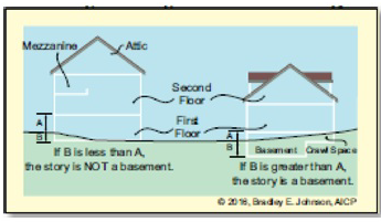 Basement. An area within a building predominantly below the finished grade. Specifically, a basement shall have no more than 10 percent of its perimeter greater than three feet above grade; and no point along its perimeter shall be greater than five feet above grade (measured vertically from the bottom of the floor joists of the floor above to the average finished grade around the building). Basements are not considered a story.