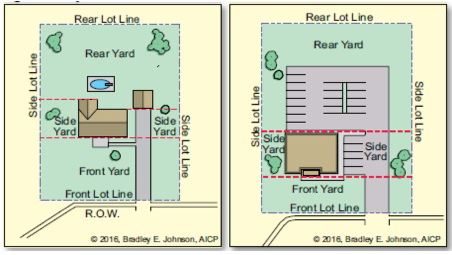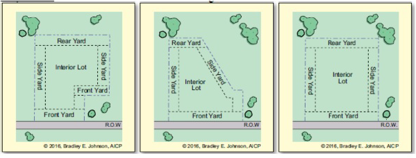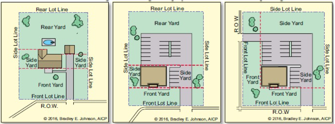 Yard, side. Area on a lot which is not defined as a front yard or a rear yard, roughly described as the area between the side foundation and the side lot line between the front yard and rear yard. This definition also applies to the largest storage-based or support-based accessory structure with a permanent foundation on a lot without a primary structure.