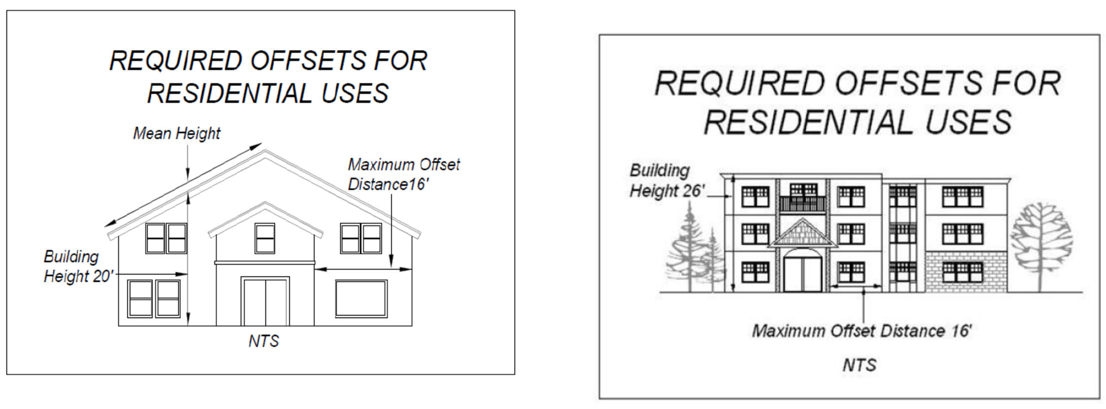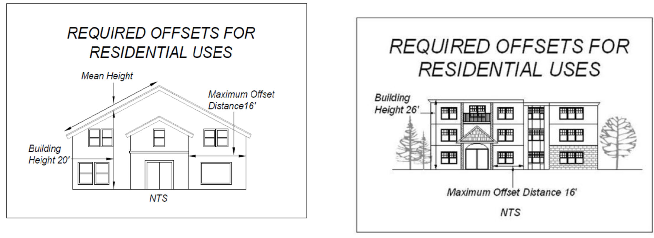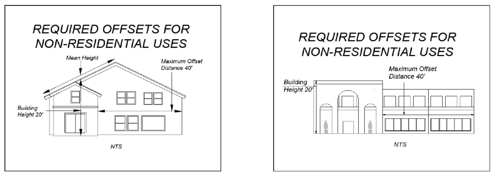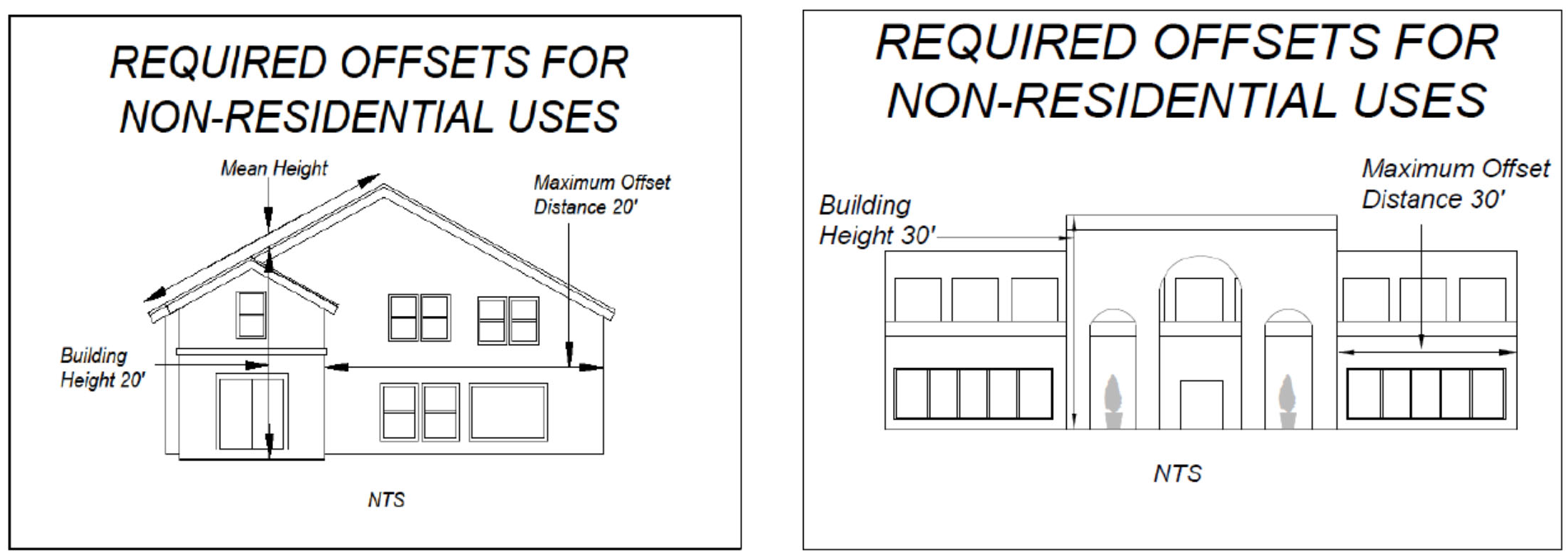 The distance between required offsets is related to the height of the building wall on a two-to-one basis. A building façade which is less than or equal to the height of the building shall not require an offset.