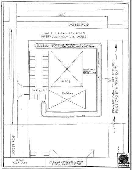 Stormwater management systems shall be designed with a 4:1 slope and shall to be graded from the top-of-bank to a break-point at least six feet below the control elevation of the excavated area. Below this break-point, slopes shall be no steeper than 2:1 to the bottom of the excavation. Dry detention systems may be a minimum of 2:1 slope.