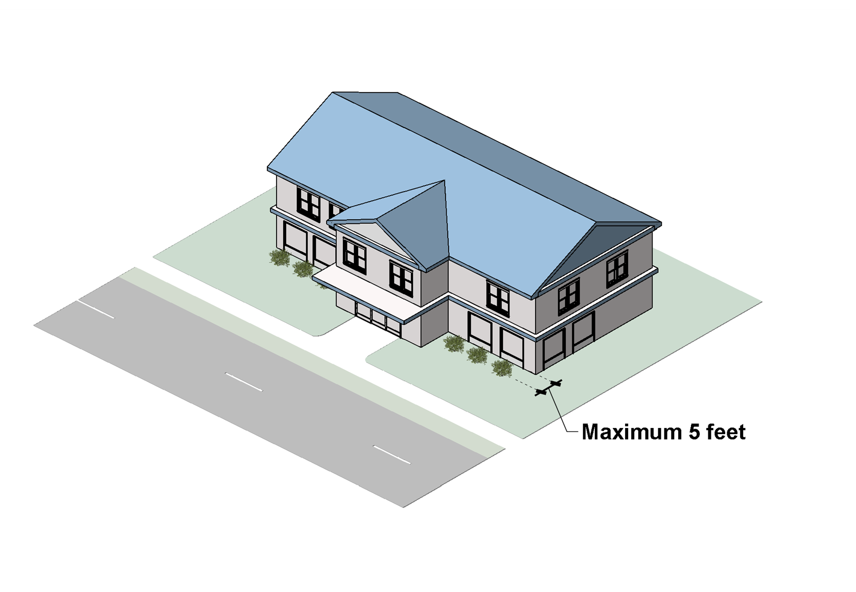 For townhouse developments, parking lots must be set back at least 15 feet from any existing or proposed public right-of-way (see also Sec. 24-5312.B, Perimeter Landscaping). Individual townhouse dwelling lots fronting on public streets must not have front-loaded garages, individual driveways, or parking spaces facing the public street. For individual townhouse dwelling lots fronting on a private access, parking must not be located in a front yard except as a driveway serving a permitted front-loaded garage (one driveway space for each garage space). Such parking must be at least 18 feet deep by 9 feet wide exclusive of sidewalks and easements.