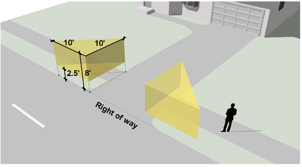 On corner lots, they must be located a minimum of 25 feet from the intersection of property lines and reference lines as defined in Sec. 24-8307.A, Front Yard or Street Side Yard;