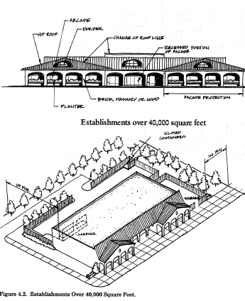 The use of a common palette of building materials should be maintained for building façades to create a consistent and traditional architectural identity. Traditional architecture shall include, for example, the use of brick, pitched roofs, low-profile signage, and subdued colors. For large commercial/retail buildings and multifamily buildings, variations in façade, roofline and depth should be provided to lend the appearance of multitenant occupancy. All design and construction shall be subject to architectural review by the county or its designated architect to ensure adherence with this subsection K and the structures of traditional architecture.