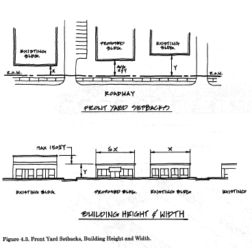 [New building widths.] New buildings shall be consistent with existing building widths, through one (1) of the following methods (See figure 4-3):