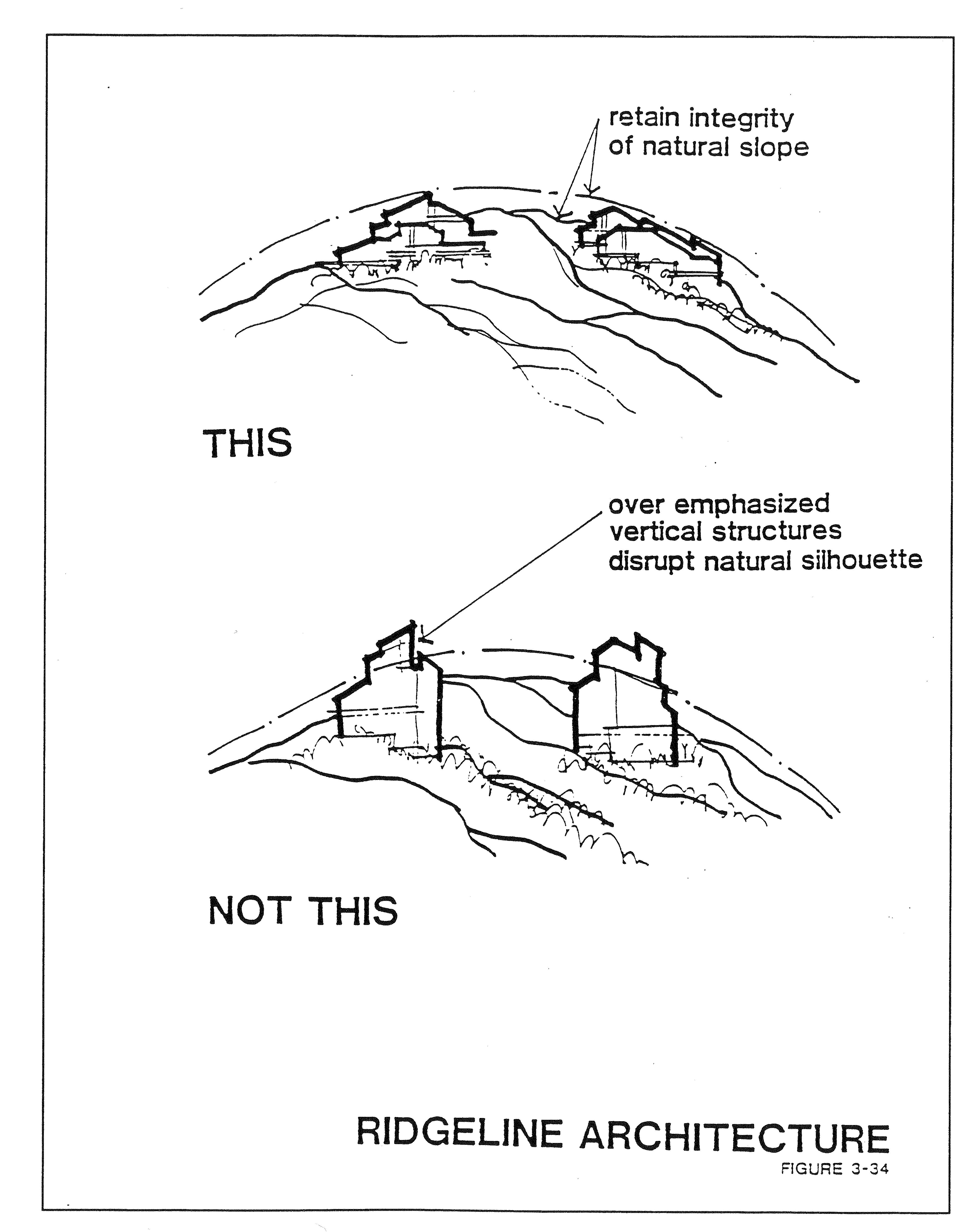 Homes constructed along ridgelines shall be designed to be compatible with the general gradient of the existing landform. The developer should avoid architectural styles that over emphasize vertical surfaces and disrupt the natural silhouette of the ridge.