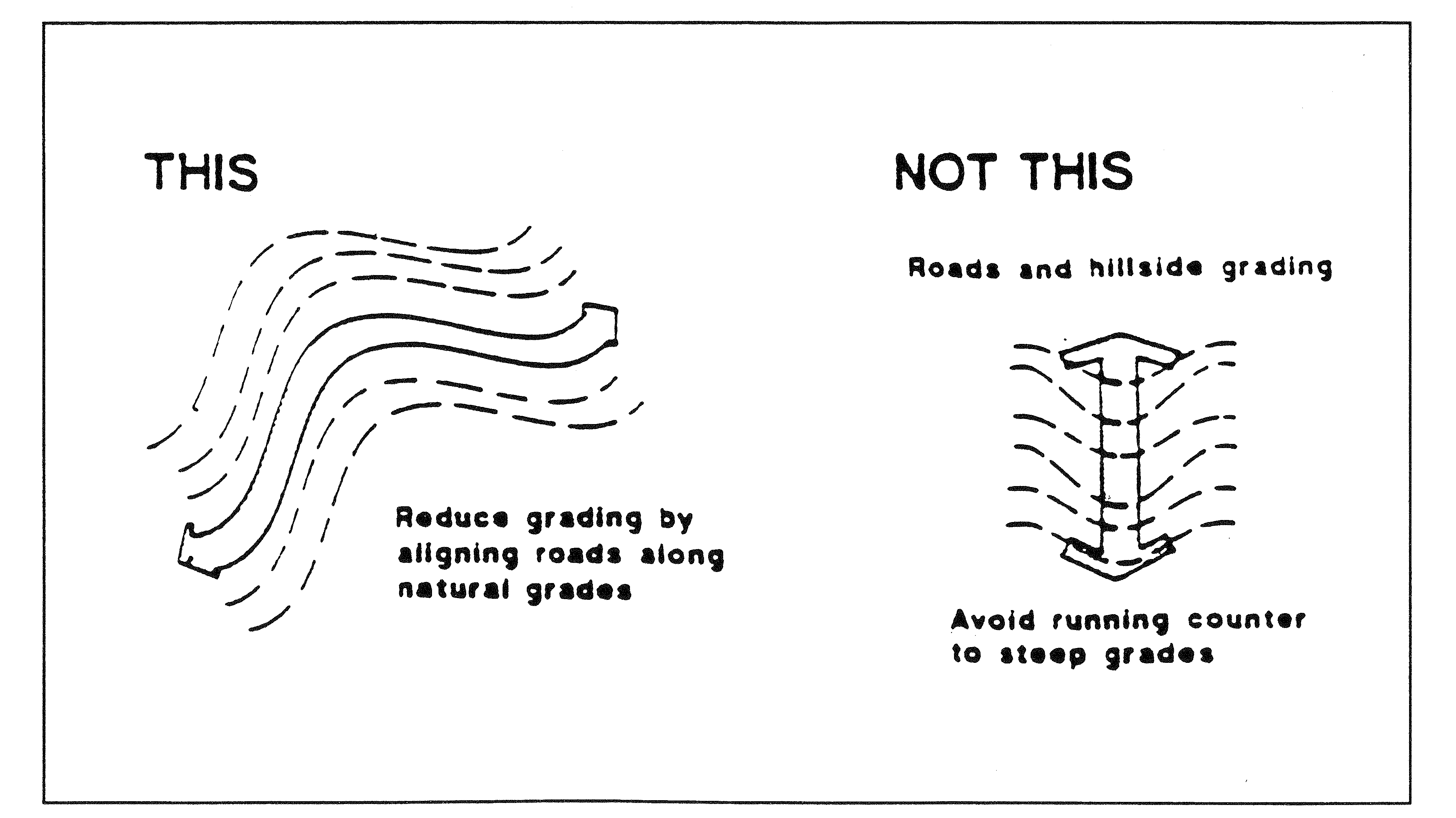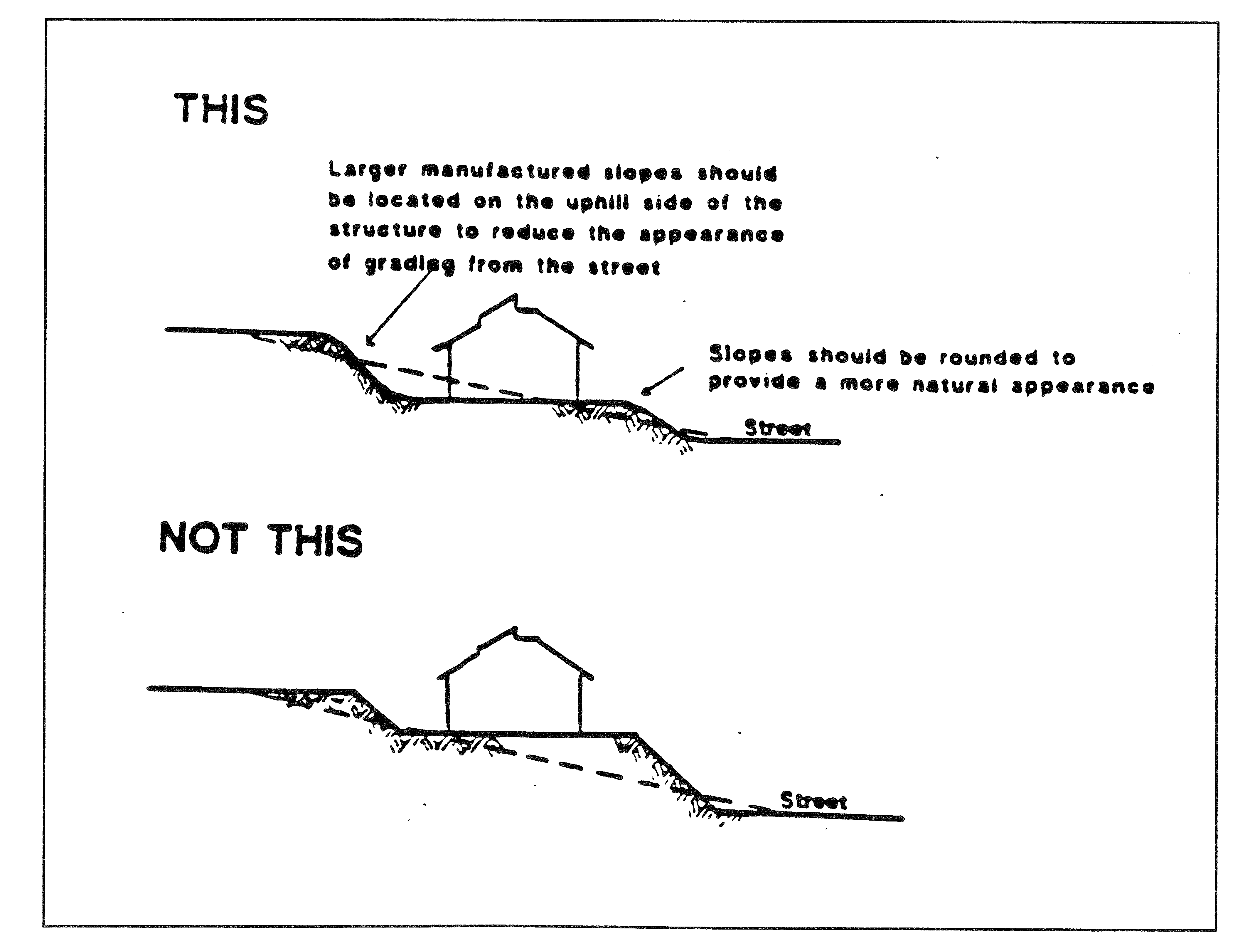 Design of building sites should be located to the natural terrain. Structures should be located in such a way as to minimize necessary grading and to preserve natural features such as prominent knolls or ridgelines.