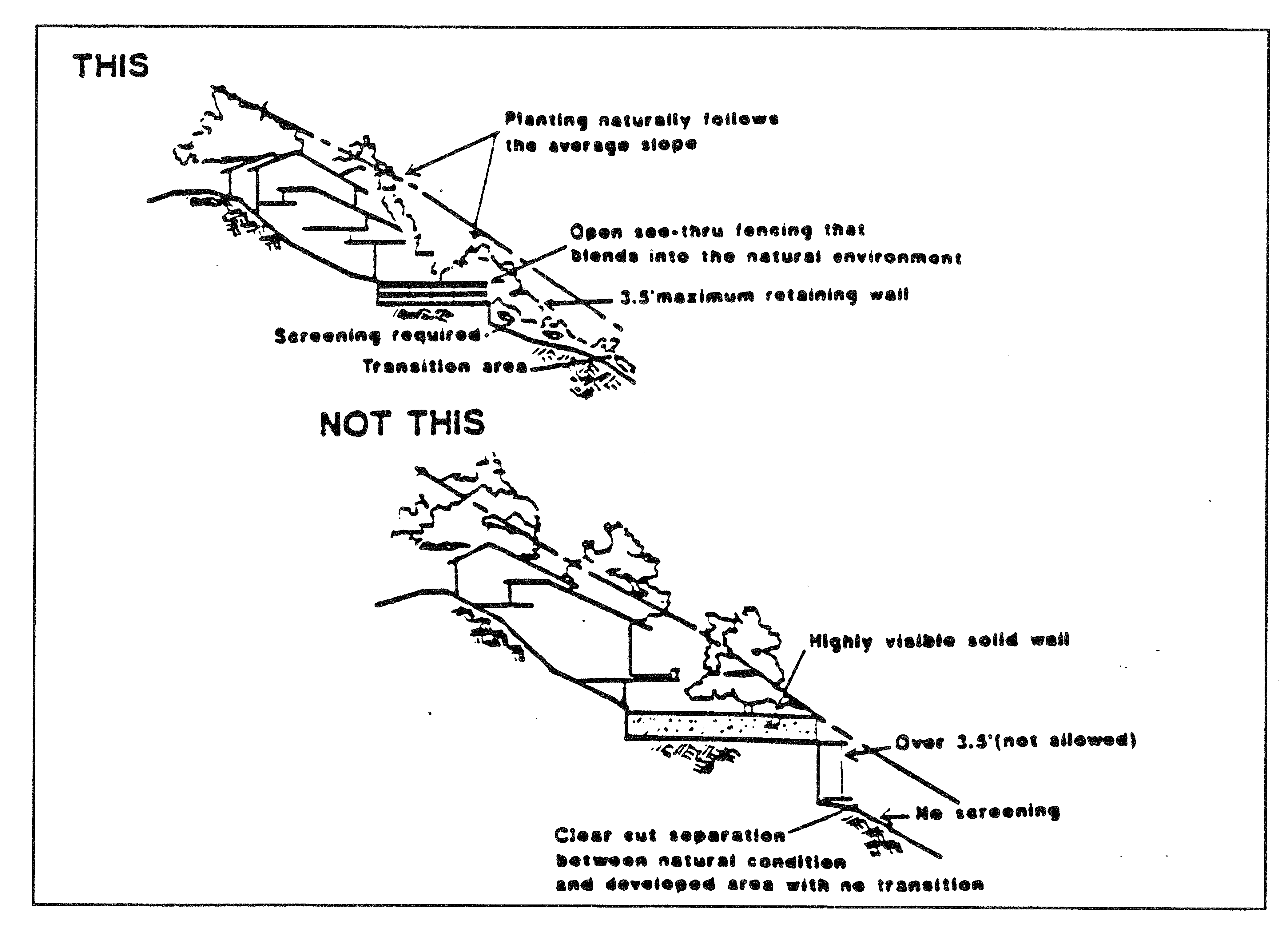 Retaining walls or other support structures should be designed to minimize their visual impact through techniques such as terracing, crib walls, and appropriate landscaping.