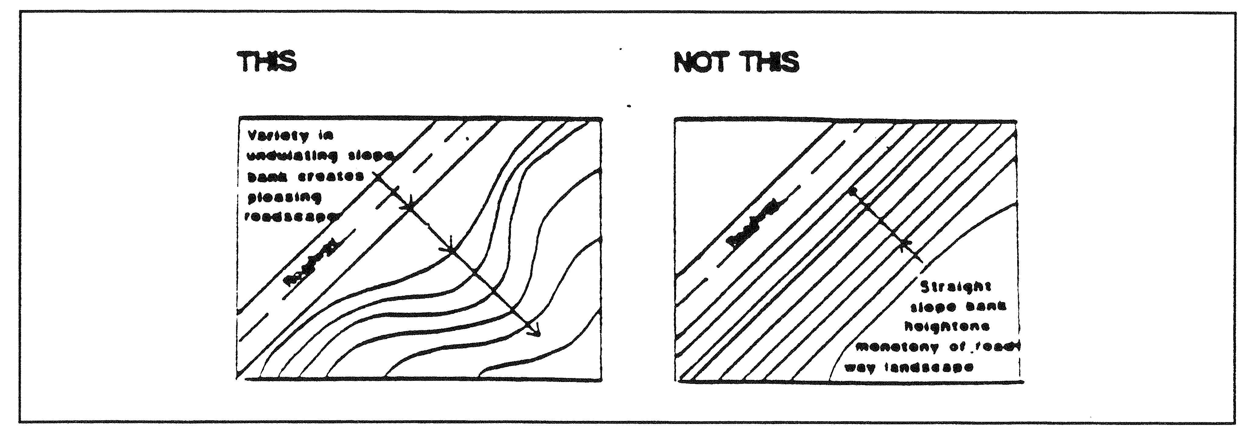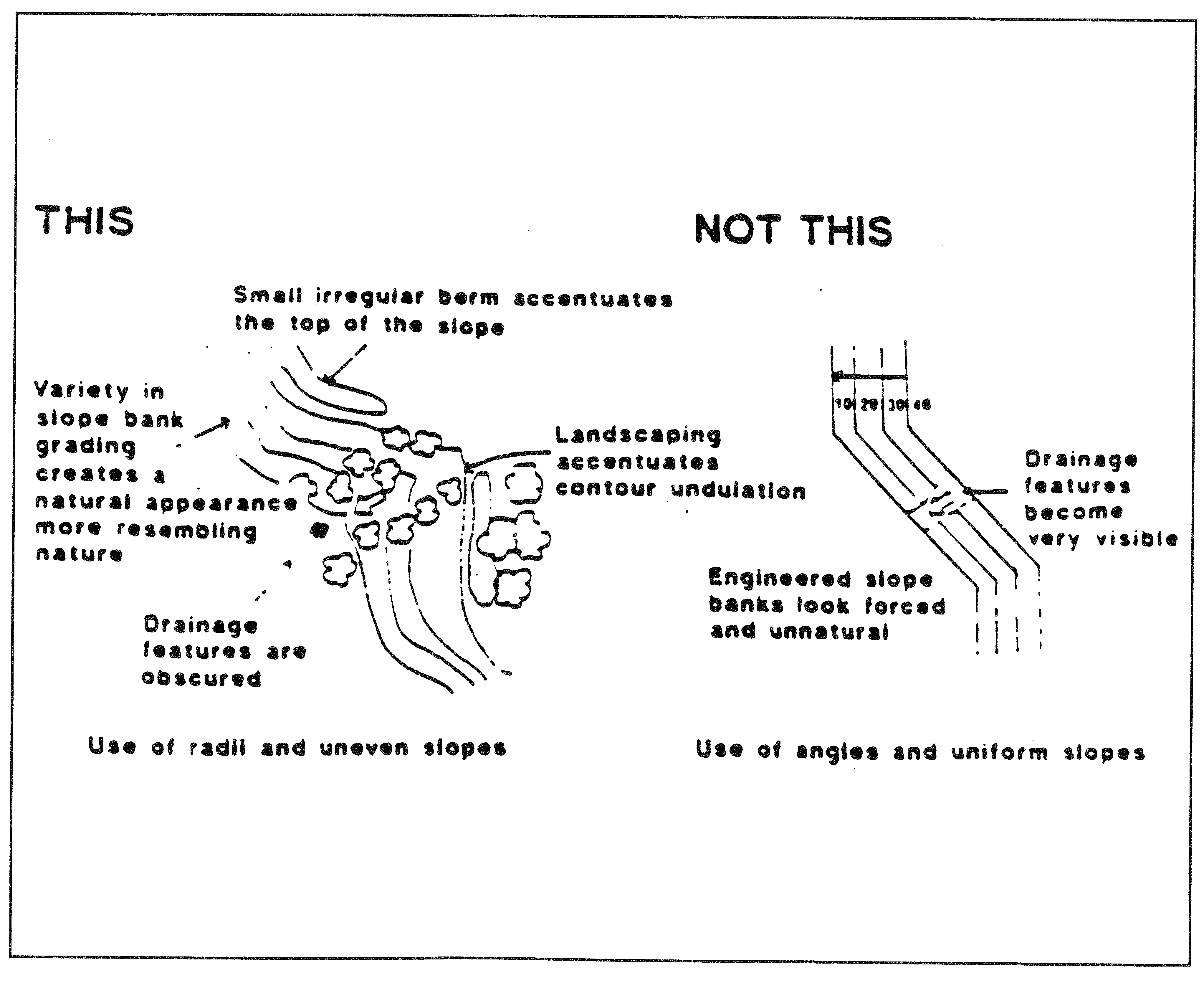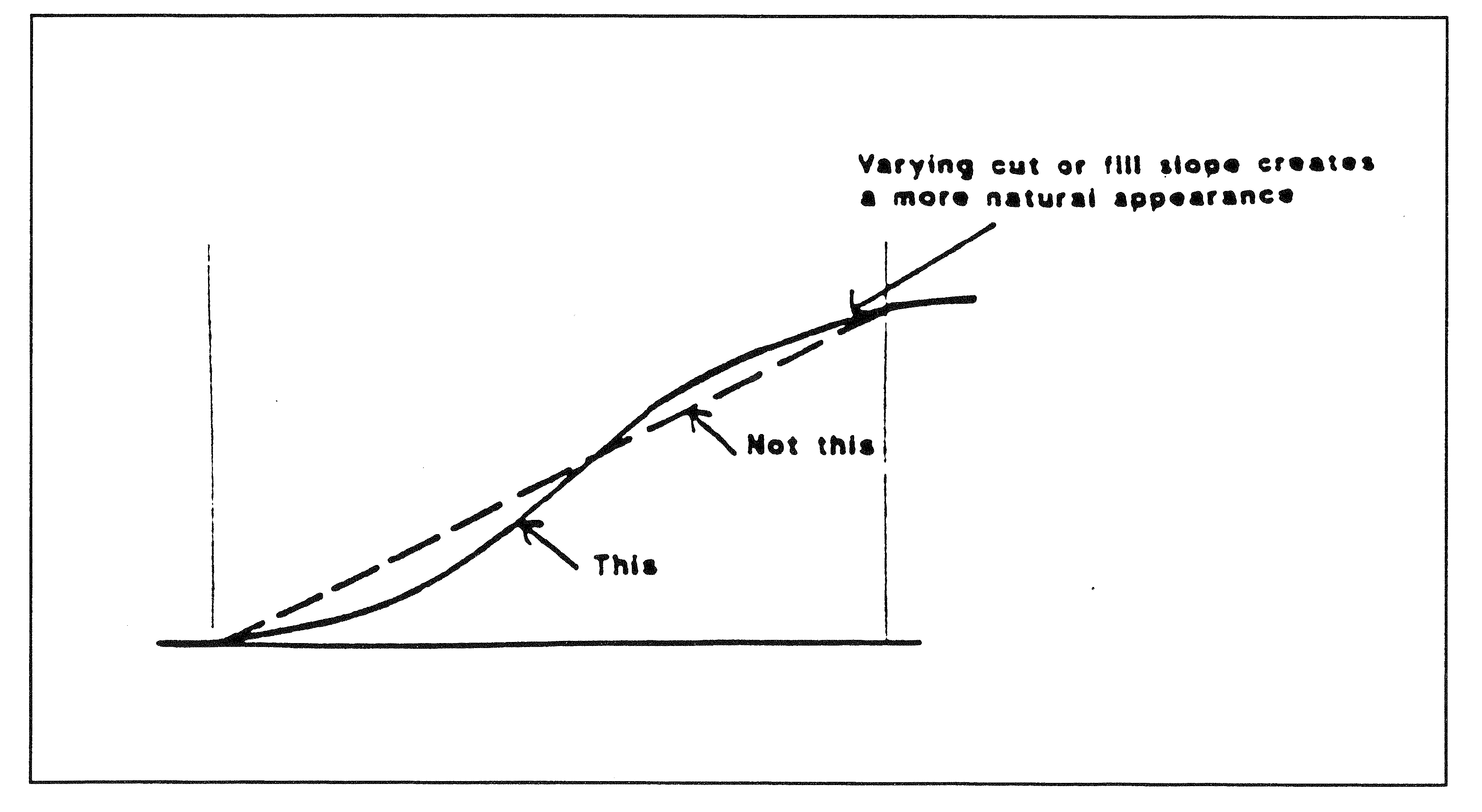 Hard edges left by cut and fill operations should be given a rounded appearance that closely resembles the natural contours of the land.