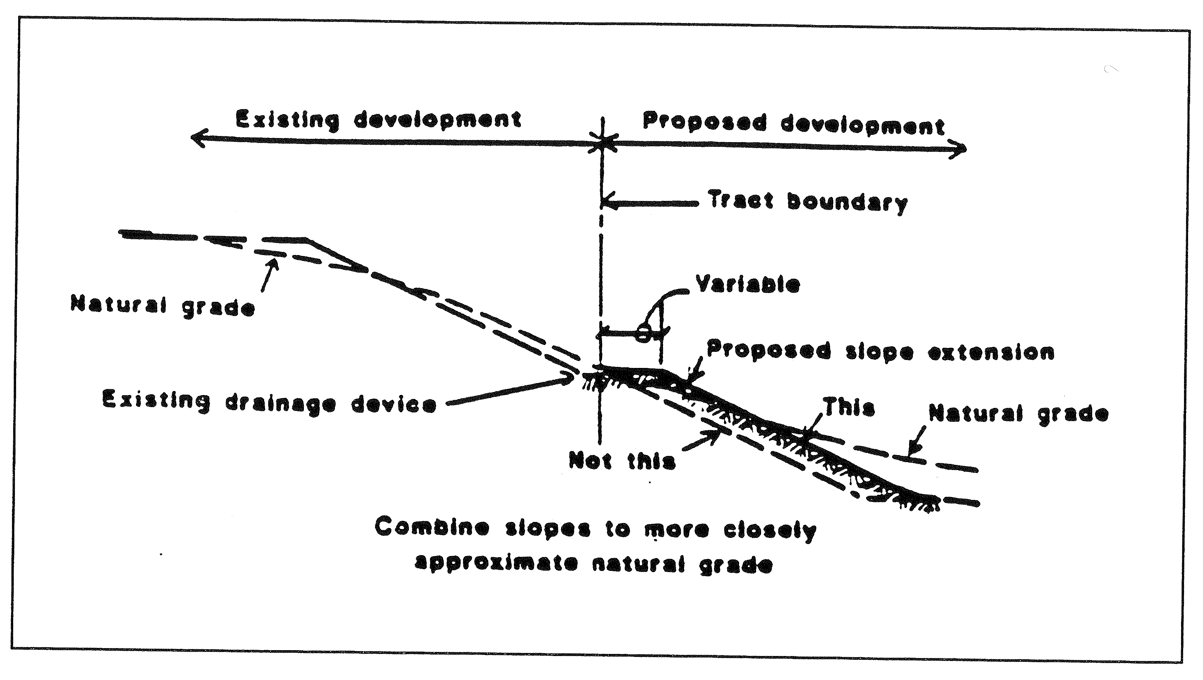 Contour grading techniques should be used to provide a variety of both slope percentage and slope direction in a three dimensional undulating pattern similar to existing, adjacent terrain. The following concepts should be utilized: