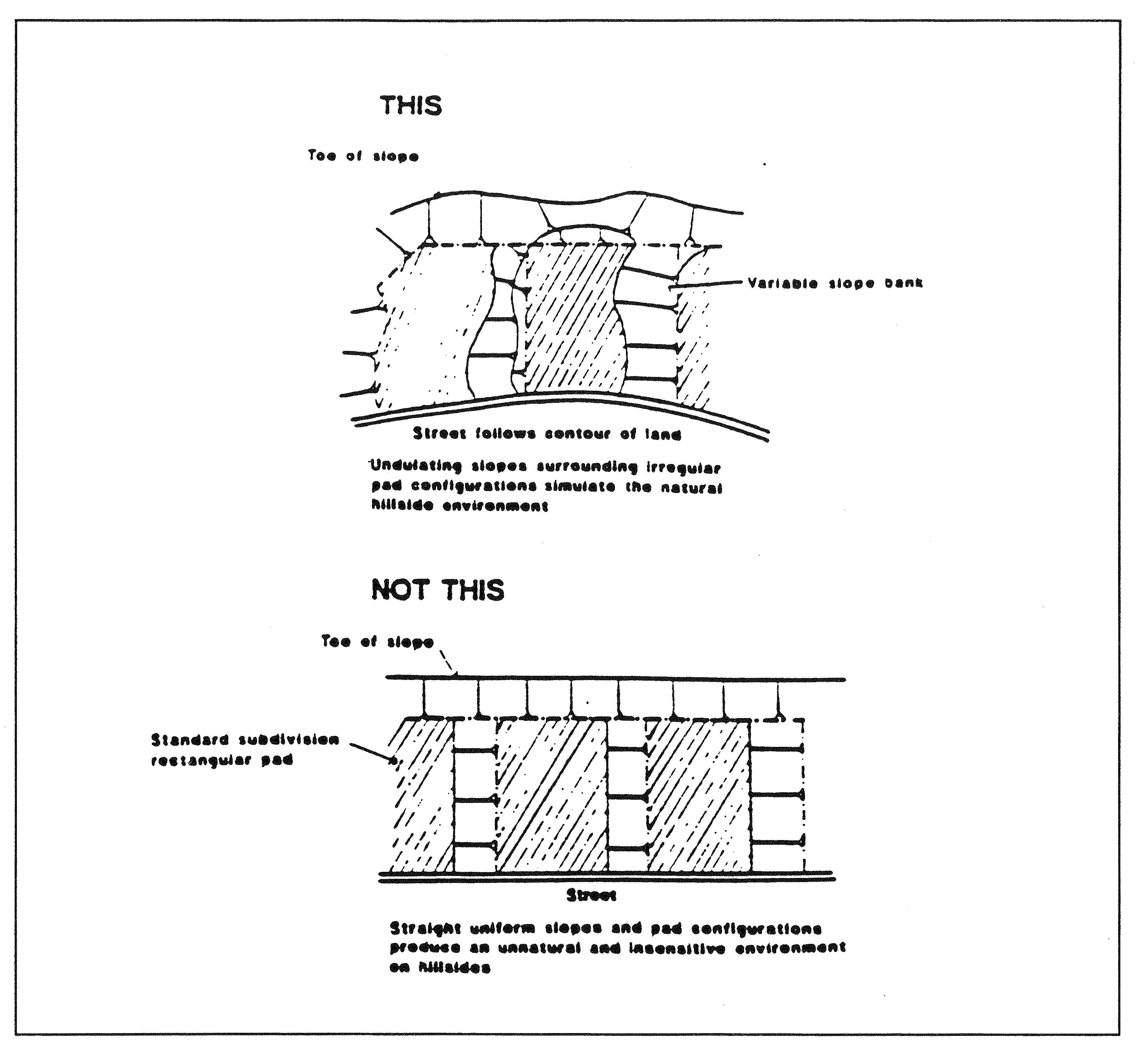 When adjacent pad elevations exceed ten feet, and terrace grading techniques are used, the pad configuration should be softened with variable, undulating slopes created to give a more pleasing and natural appearance.