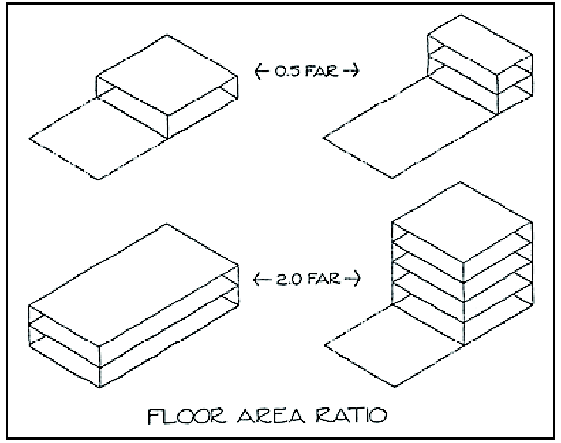 The "floor-area ratio" or "FAR" means the ratio of the total gross floor area of all buildings on a lot to the total gross area of the lot or parcel. Exhibit "A" provides examples of the calculation of the FAR on a specific piece of property.