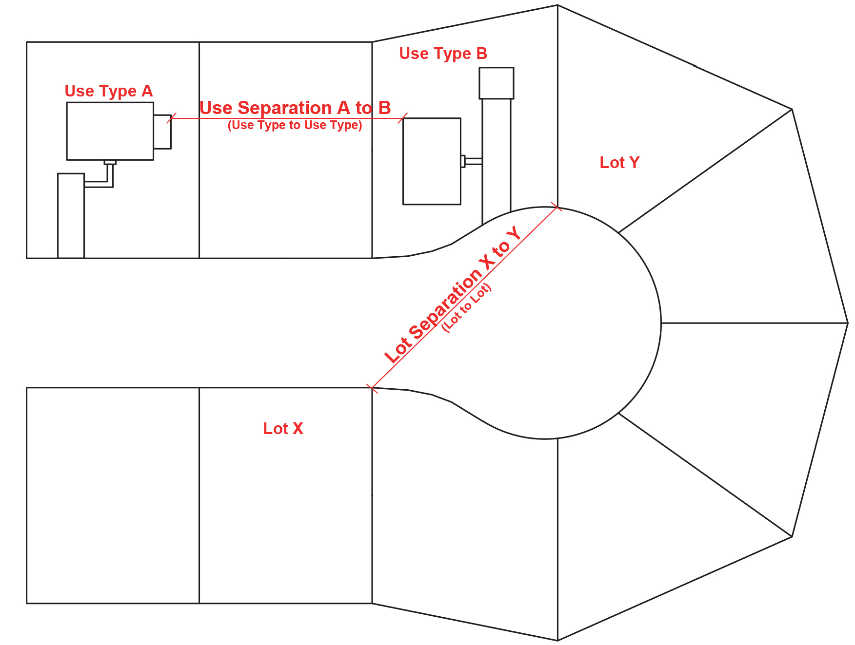 Use Type to Use Type When the provisions of this Ordinance require one use type to be separated from another use type, separation shall be measured by drawing straight lines from the nearest point of the wall of the existing or proposed principal structure to the nearest point of the wall of the existing or proposed structure subject to the separation requirement.
