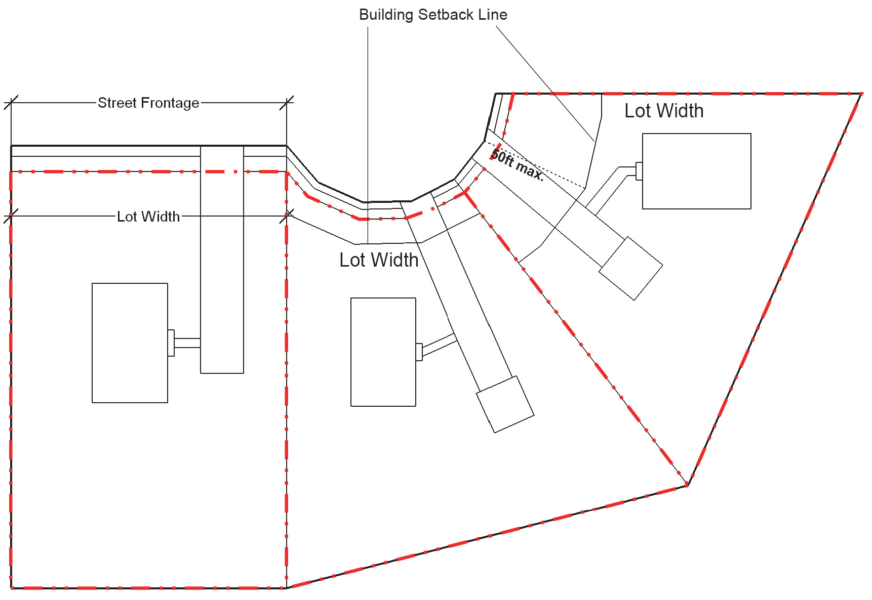 Lot Width The distance between straight lines connecting front and rear lot lines at each side of the lot, measured at the inside edge of the front setback. On cul-de-sac lots, lot width is measured at a front street setback of up to 50 feet from the right-of-way (which becomes the minimum building line).