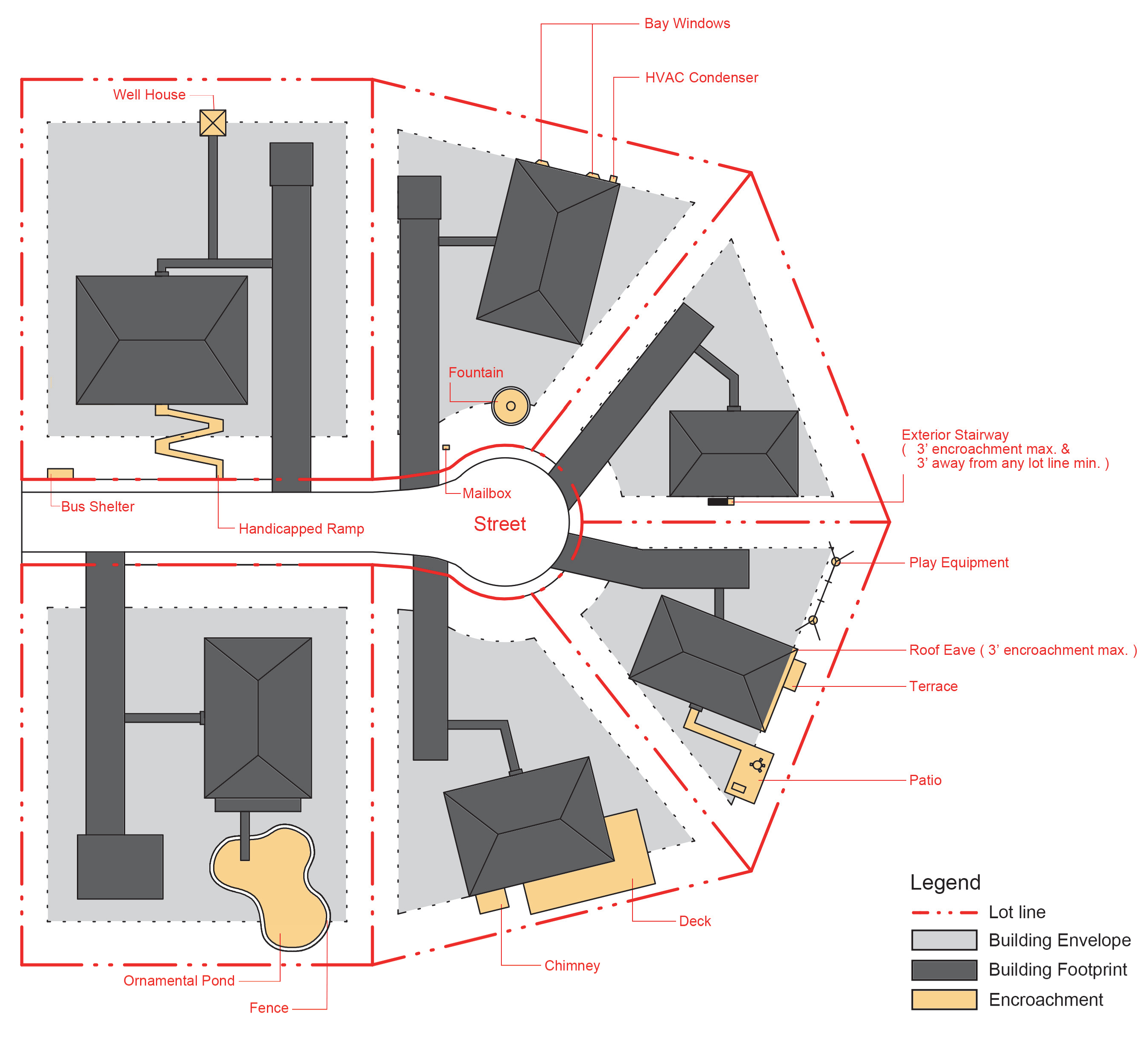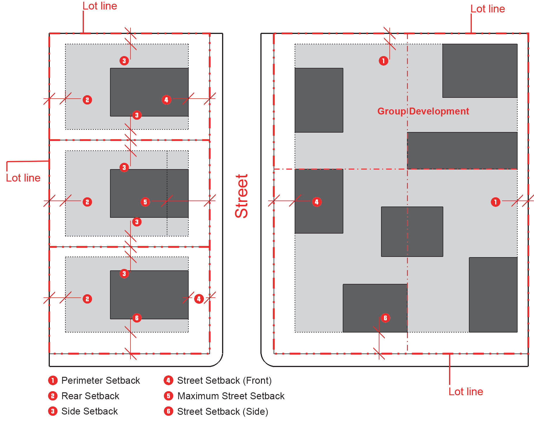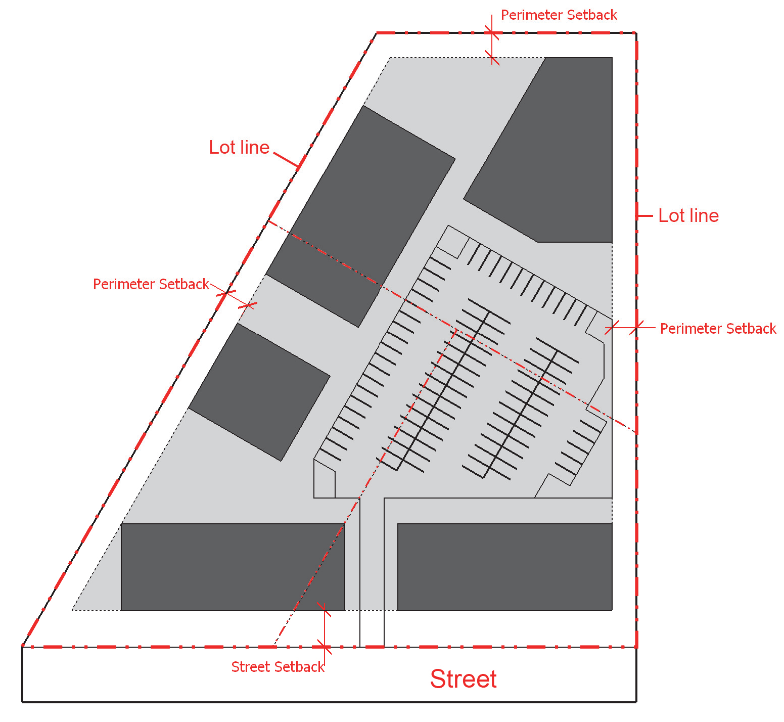 Perimeter Setback Setbacks applied to single building developments, group developments and multiple lot developments. When applied to group developments or multiple lot developments it applies only to the outermost buildings along the perimeter of a development. A perimeter setback does not apply along streets.