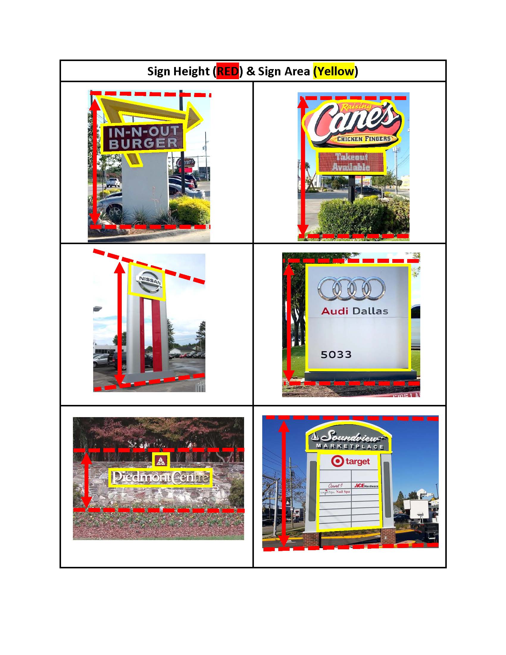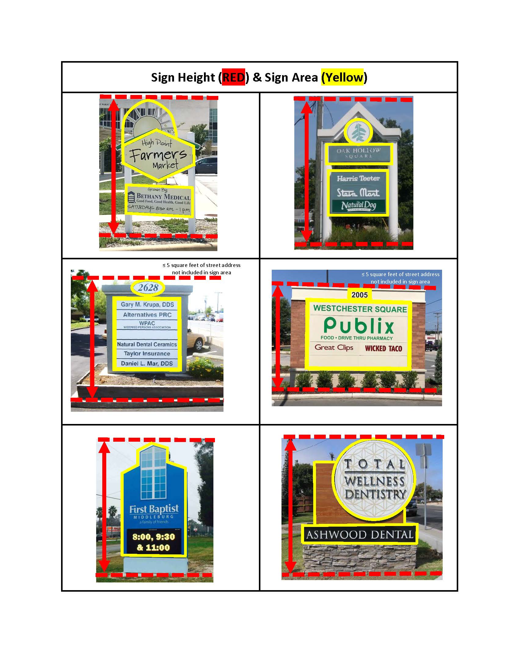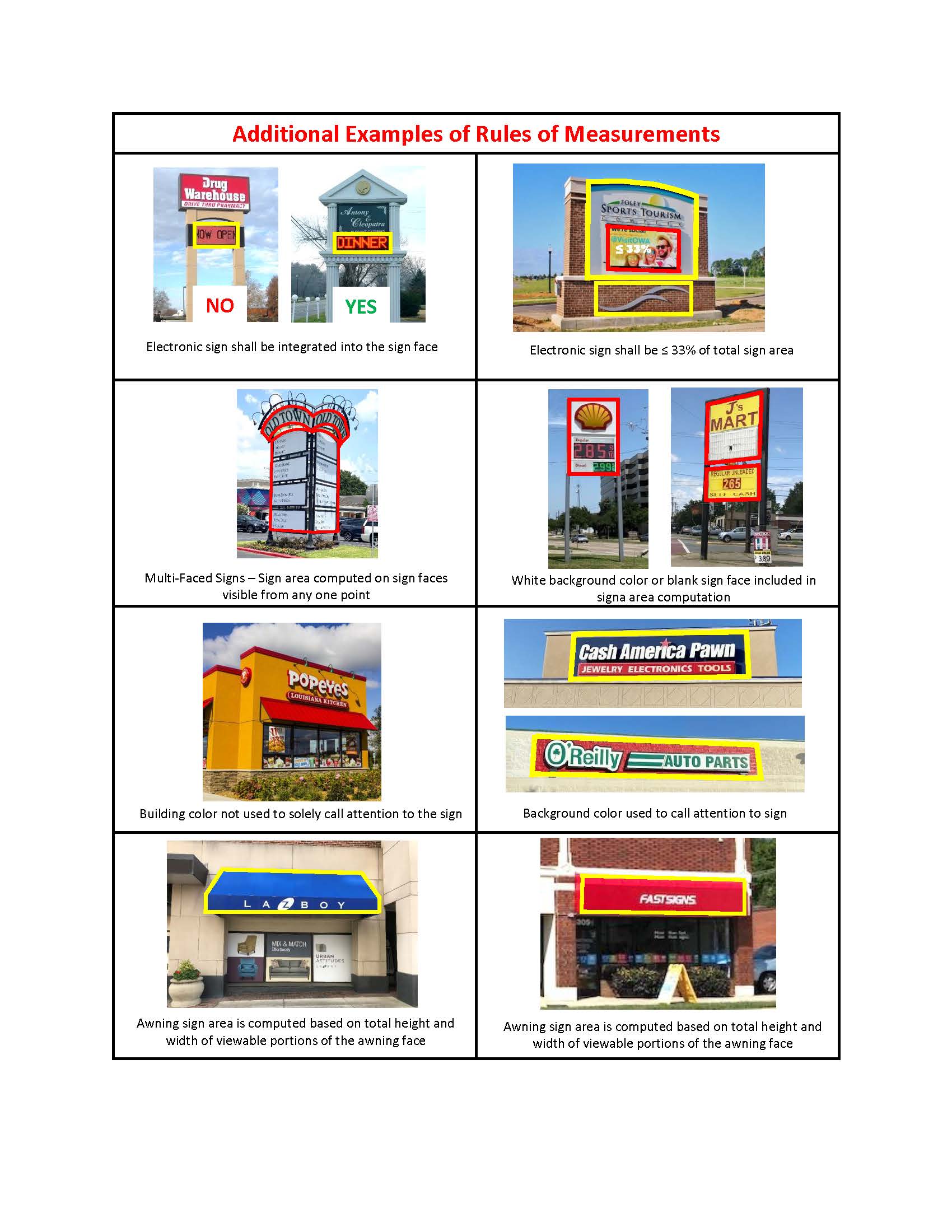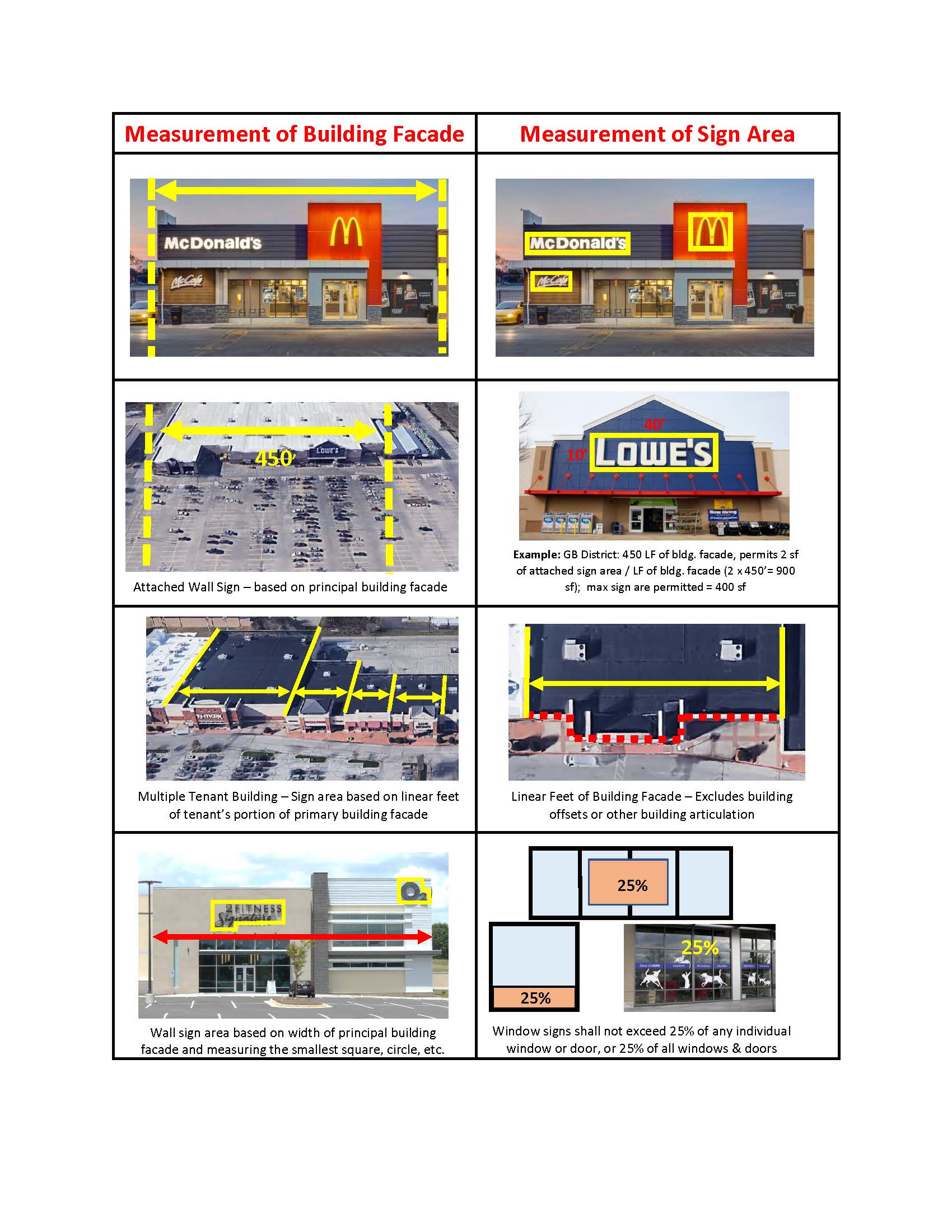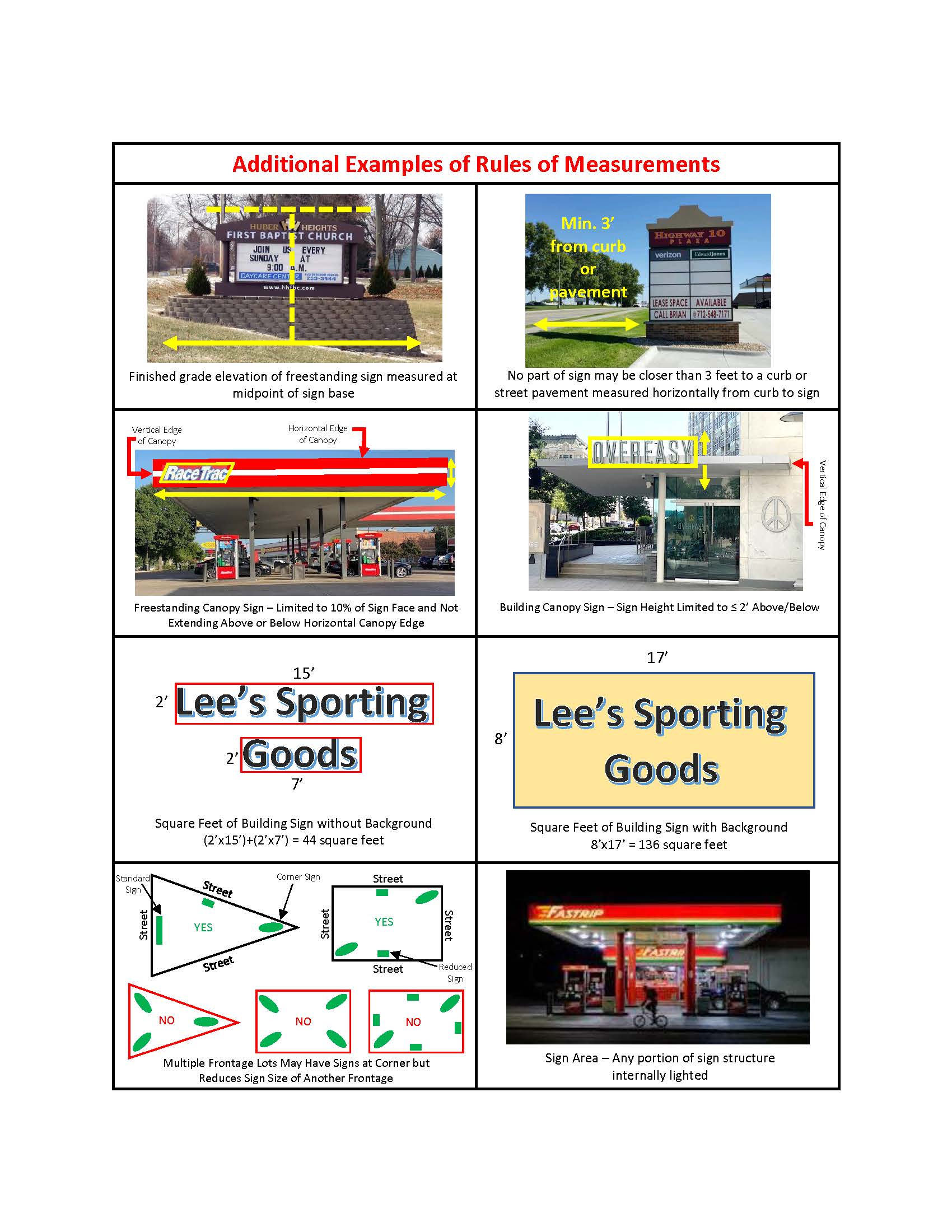 Purpose This section provides rules of measurement for sign area, height, and number. Graphics are provided to illustrate how the rules of measurement are applied to enable users to better understand sign measurement standards. These graphics are provided as a convenience and do not replace the written rules of measurement.