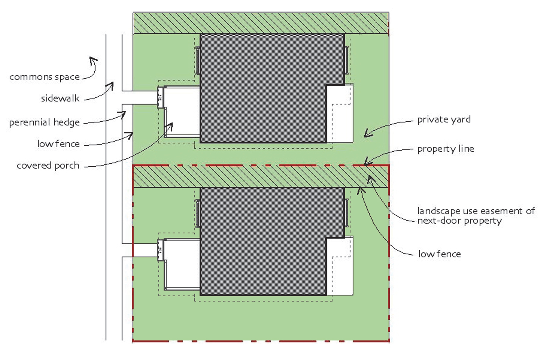 Use Easement Any lot abutting another lot used for residential purposes in a pocket neighborhood shall be subject to a use easement on one side that extends from the lot line to the exterior wall of the dwelling (see Figure 5.14.6.D1, Use Easement). The purpose for the use easement is to ensure each dwelling has a private outdoor space.