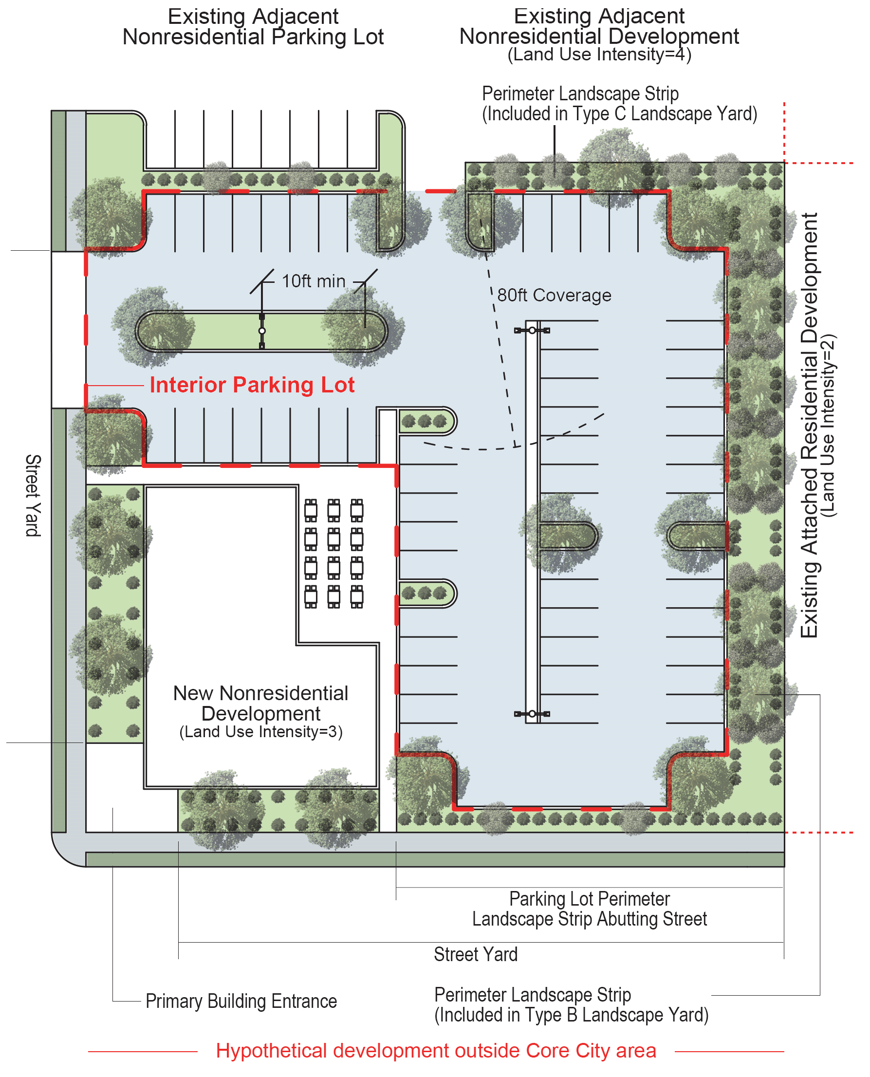 Compliance with the landscaping standards are met if the required perimeter landscape yards are provided along the multiple lot development perimeter and all parking lot landscaping requirements are met.