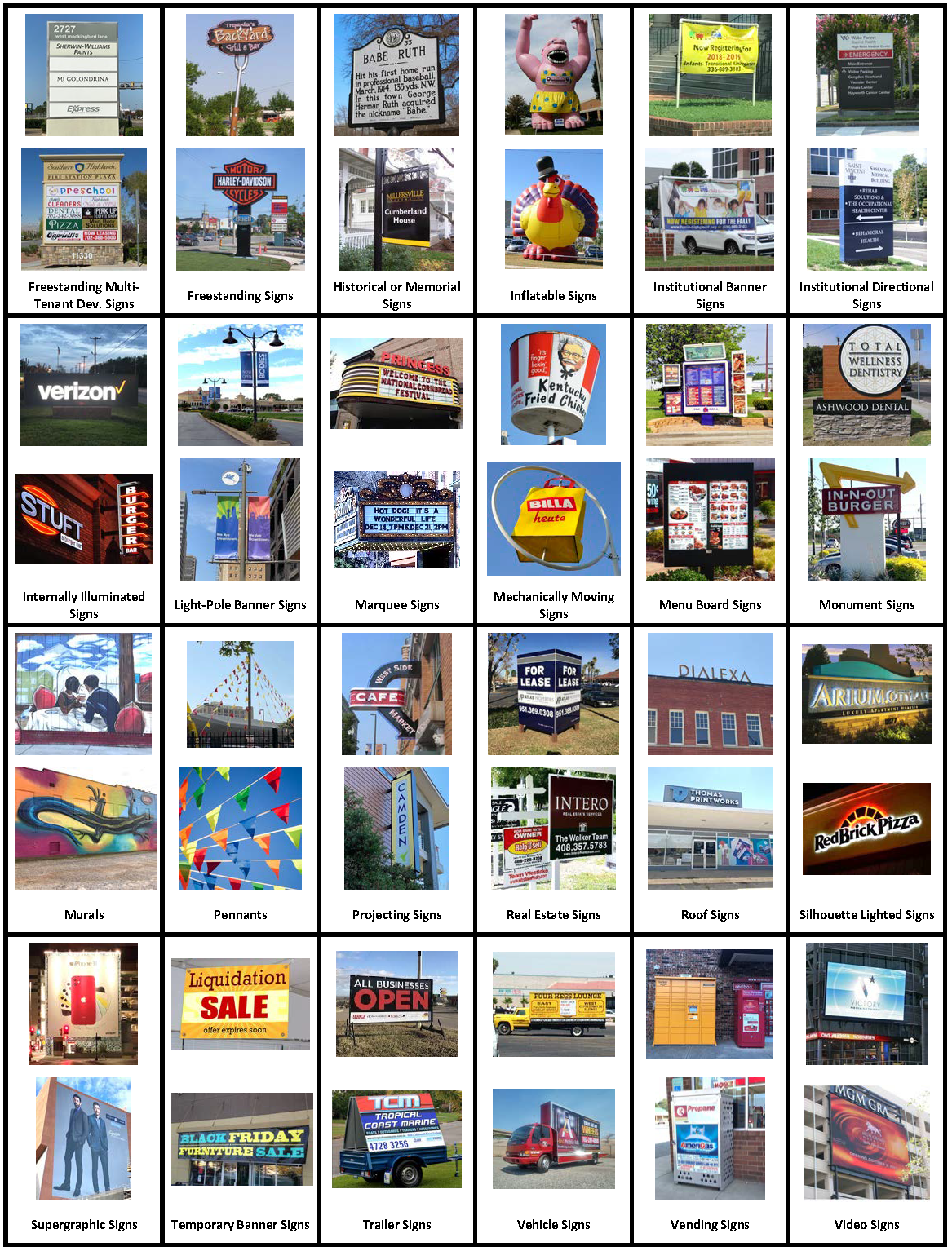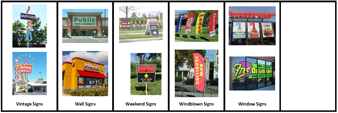 Unless otherwise allowed under this Section, the following signs are prohibited (See Section 5.7.16, Sign Images by Sign Type for visual illustration of these signs):