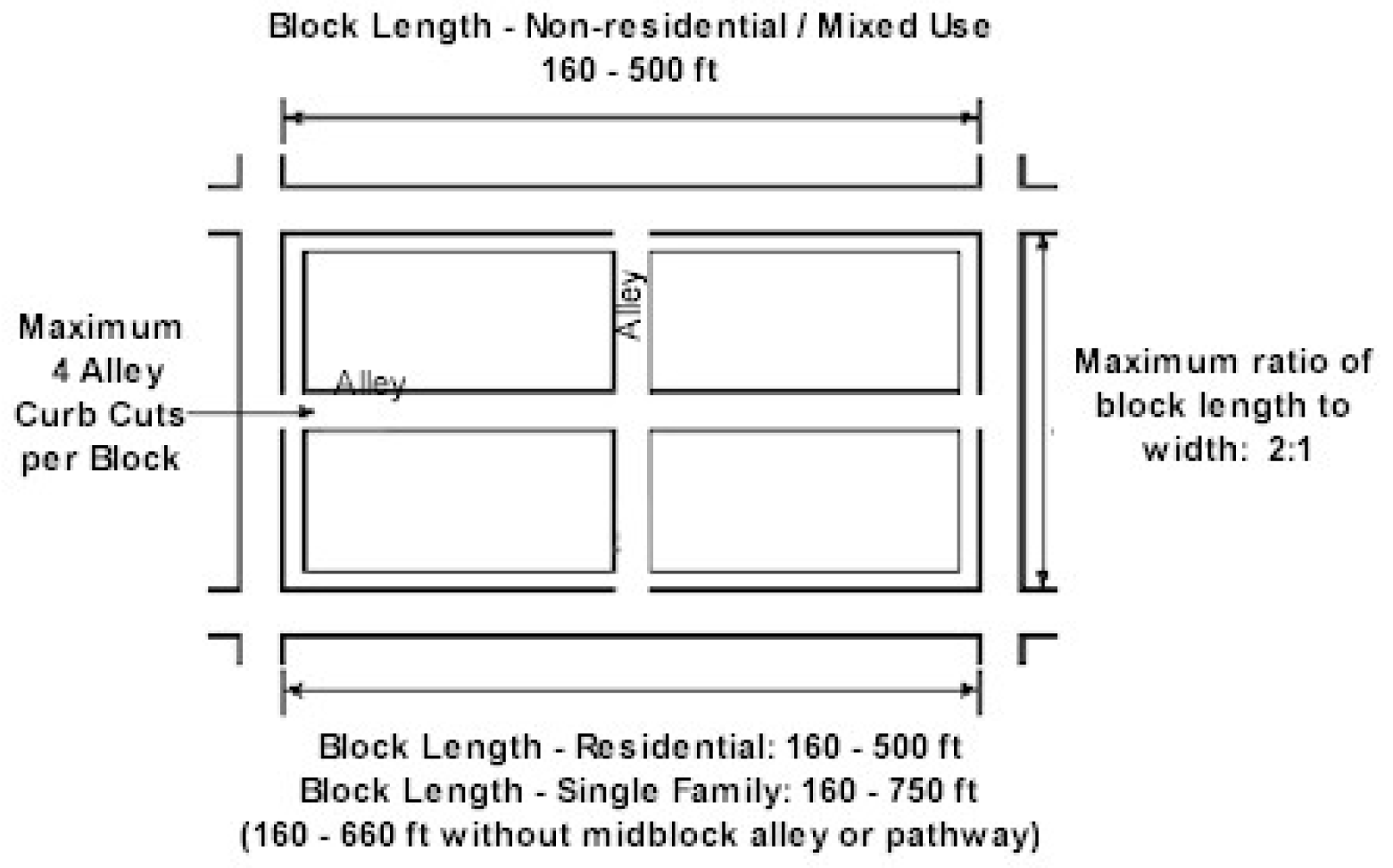 Block length shall not exceed 1,350 feet, or be less than 300 feet in length, except where necessary to intersect an existing street.