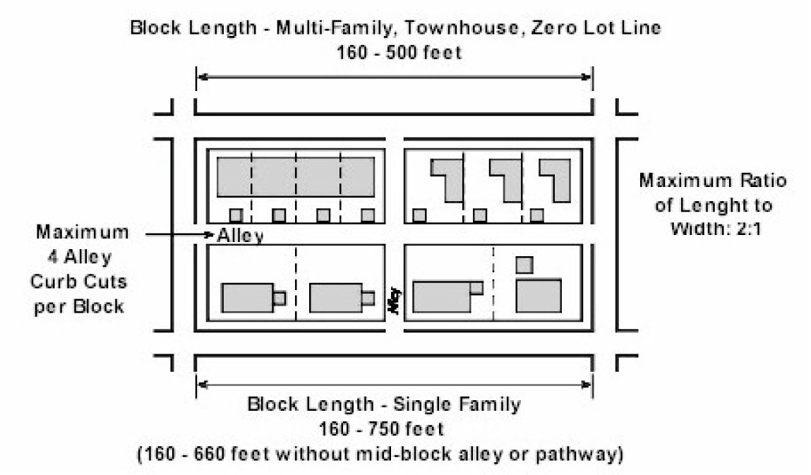 Block width, depth, shape, and orientation shall consider the need for access, circulation, traffic control, and the safety of vehicular and pedestrian movement.