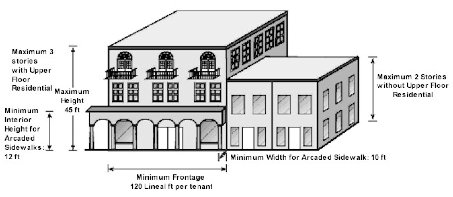 12 If residential uses are on upper floors, the maximum number of stories is 3 and the maximum height is 45 feet.