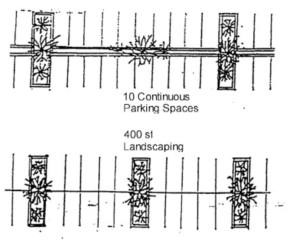 To prevent vehicle overhang on private property in the vicinity of curb breaks, off-street parking areas, and off-street loading areas, a six-inch raised curb and/or parking stops shall be constructed a minimum distance of three feet inside the street right-of-way line or property line;